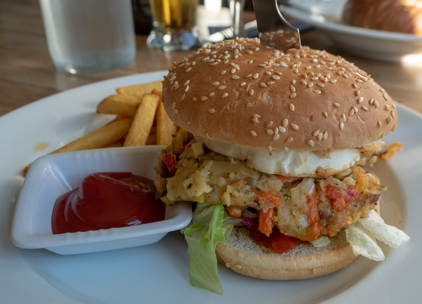 Hotellin alakerrassa on ravintola, joten siinä missä Säppiin on lähdettävä eväiden kanssa, Kylmäpihlajalle ei välttämättä tarvitse ottaa mukaan mitään. Me söimme illalla paikan ilmeisen legendaarisen leivän sisällä tarjotun lohikeiton ja puosun burgerin kasvispihvillä ja vuohenjuustolla. Maittavia valintoja molemmat. Omaa oluttakin löytyy, kuten myös omaa suklaata! Huoneen hintaan kuulunut aamiainen oli myös ihan riittävä, joskaan se ei erityisiä maininnan arvoisia kohokohtia sisältänyt.