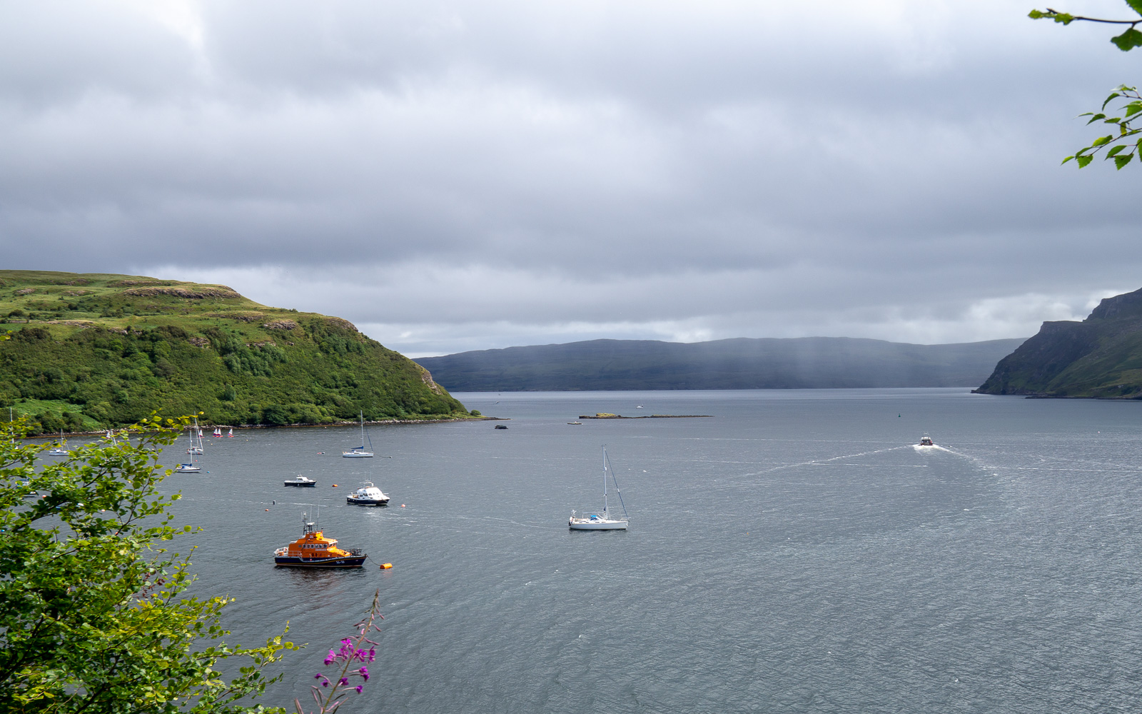 Ensimmäinen ranta johti toiseen ja päädyimme satamaan: kalastusaluksia, värikkäitä taloja ja mukavan näköisiä kalaravintoloita. Ja turisteja, eli taitavat useimmat Isle of Skyen kävijät sittenkin käydä myös Portreessä.