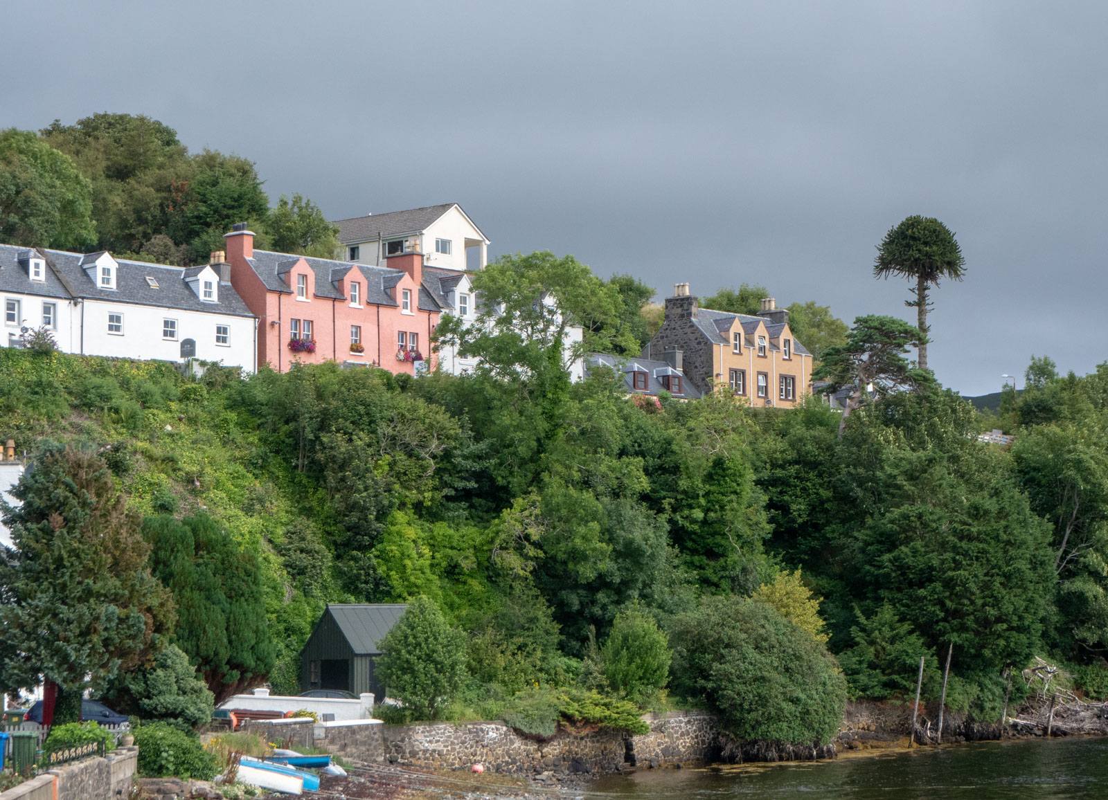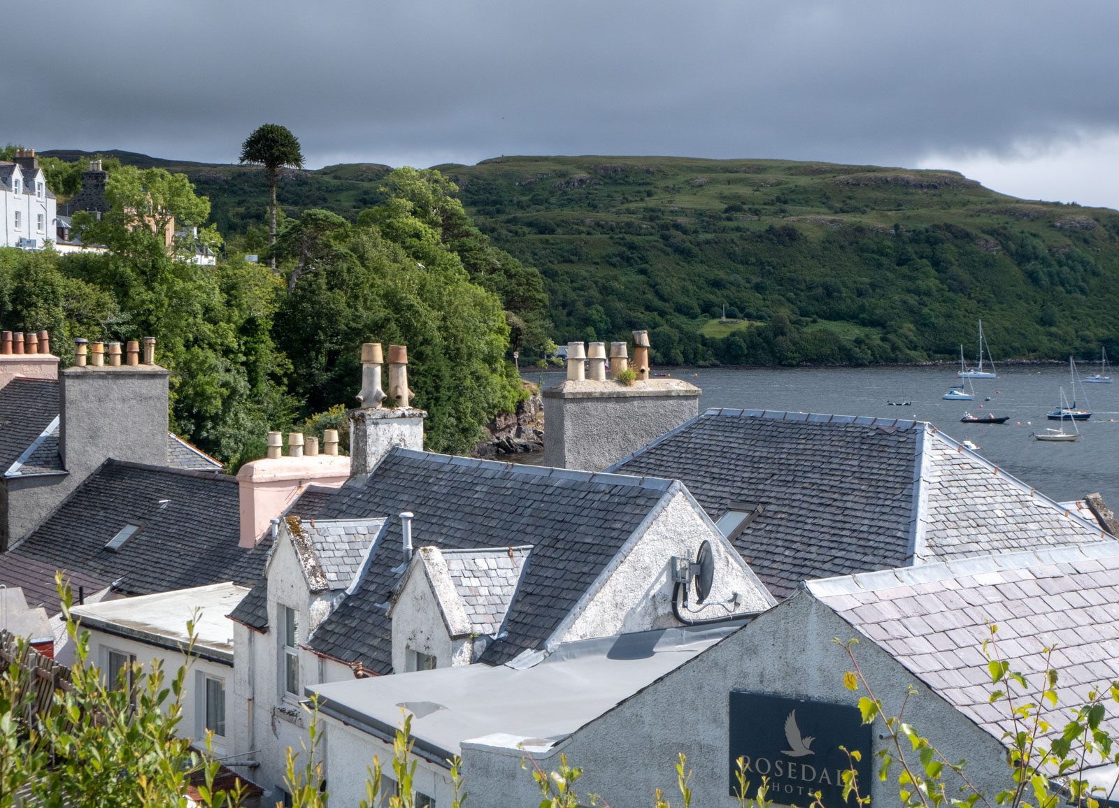 Ryhmämme innokkaat vaeltajat aloittivat toisenkin päivän vaelluksensa Isle of Skyella Sligachanin hotellilta, josta matkaa Portreehen on vain n. 10 kilometriä. Muiden lähtiessä maastoon me hyppäsimme taksiin ja ajoimme tähän pieneen ja viehättävään pääkaupunkiin. Bussejakin olisi mennyt, mutta harvakseen, joten emme halunneet hukata tuntia odottamalla seuraavaa bussia Sligachan – Portree -välillä, etenkään kun taksimatkakin maksoi vaan 20 puntaa.