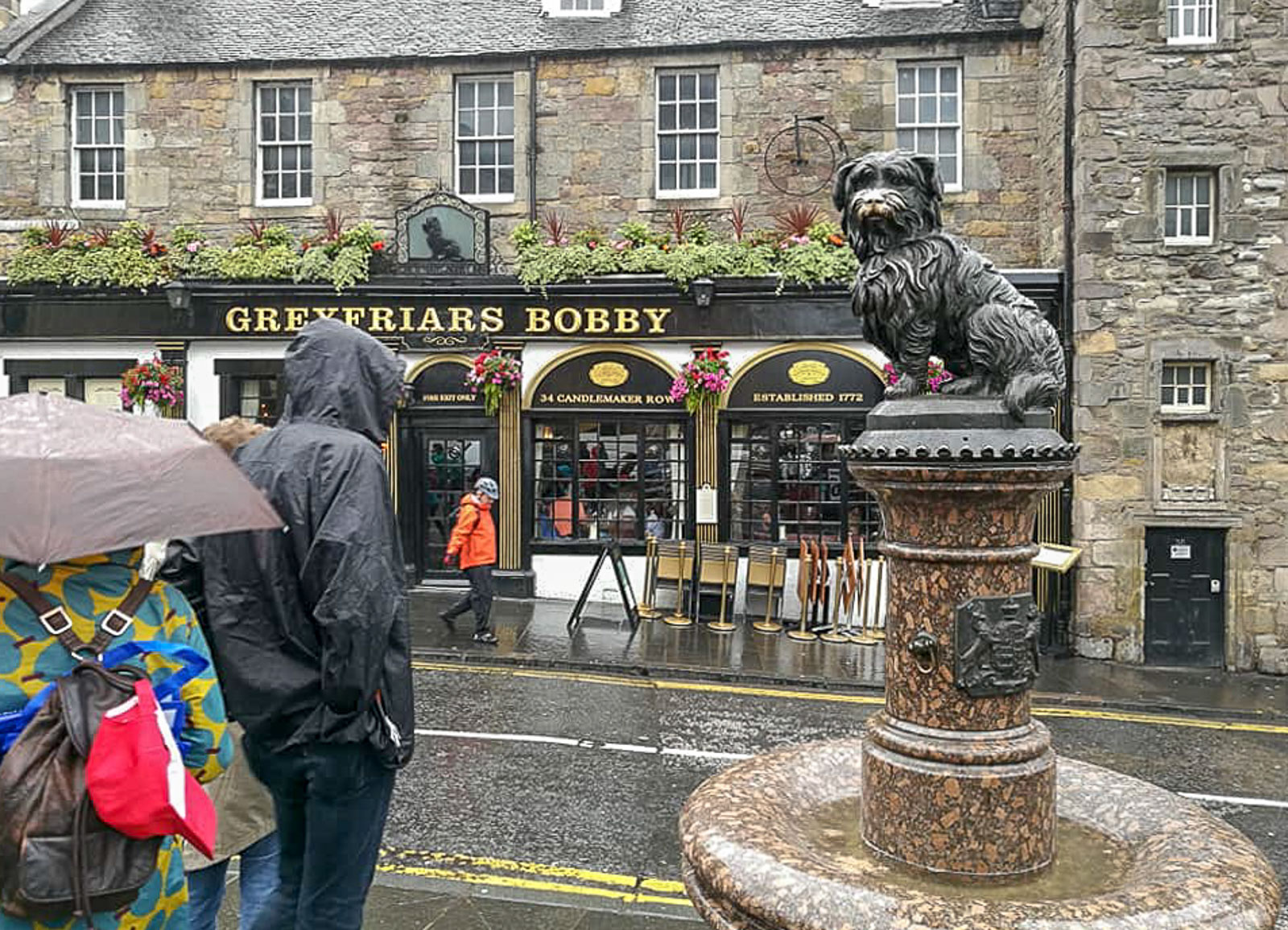 Museoista puheenollen, Tema-opas mainitsi kyllä, että Edinburghin Museum of Edinburghissa on esillä myös kaupungin uskollisimman koiran ruokakuppi ja panta, mutta jätti mainitsematta, että tämän Bobby-koiran patsas olisi ollut hiukan toisella suunnalla, Greyfriarsin Pubin lähellä. Onneksi ystävämme kiersivät samoilla kulmilla vain muutama viikko meidän jälkeemme ja nappasivat tuosta patsaasta tämän hienon kuvan.