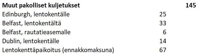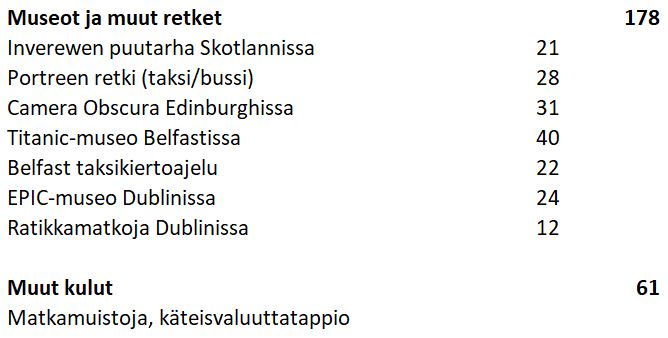 Tiesimme jo ennen kuin varasimme matkan, että halusimme liittää sen jatkoksi käynnin Belfastin Titanic-museossa, joten tarkistin ennen varausta, että tämä on matkanjärjestäjälle ok ja tuntui olevan. Saimme matkan hinnasta alennus 320 euroa (per nuppi) ja ostimme kaikki lennot itse. Tema-matkan hintaan olen sisällyttänyt myös käytännössä pakolliset juomarahat kuljettajalle (30 £) ja suomalaiselle oppaalle (10 £), jotka kerättiin matkan aikana käteisenä.