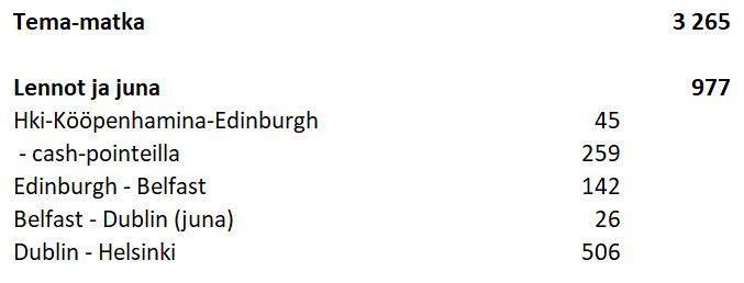 Tema-ryhmä lensi reittiä Hki – Lontoo – Edinburgh ja takaisin suoralla lennolla Edinburgh – Helsinki, me tulimme Edinburghiin suunnilleen samalla aikataululla Kööpenhaminan kautta (käytännössä Tema-ryhmän lennot olivat myöhässä vielä enemmän kuin meidän ja päädyimme odottelemaan Edinburghin kentällä yli tunnin heitä, mutta parempi näin päin).