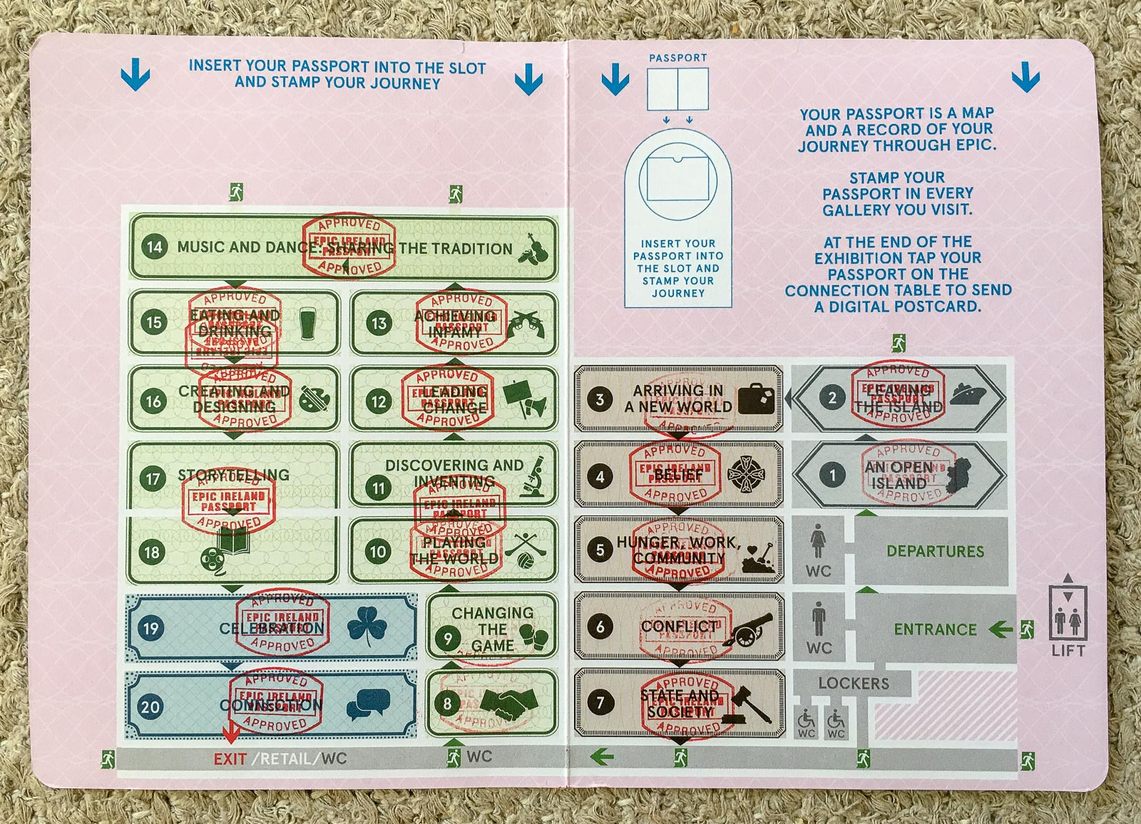 Museossa kiertelemisen teki hauskaksi, myös aikuisille, jokaiselle kävijälle jaettu “passi”, joka piti leimata jokaisessa huoneessa. Leimauslaitetta etsiessä tuli samalla myös kerrattua, että mikä oli kunkin huoneen teema ja siihen liittyvät oleelliset asiat.