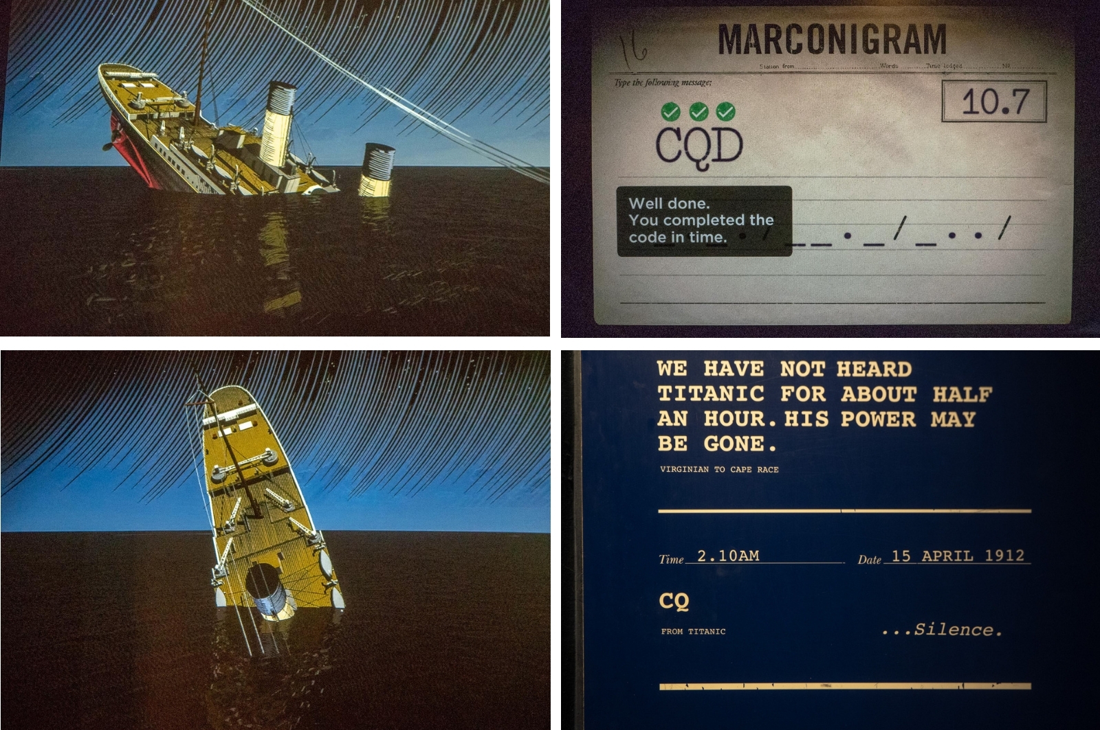 Hetken aikaa museossakin voi tunnelmoida katsellen laivan hienoja hyttejä ja sisustuksessa käytettyjä tekstiilejä. Tai viipyä kannella merta katsellen, mutta sitten, seuraavassa hetkessä vierailijakin pääsee jo morsettamaan CQD:tä, sen aikaista hätäviestiä. SOS otettiin käyttöön yleisenä hätäkutsuna vasta Titanicin haaksirikon jälkeen.