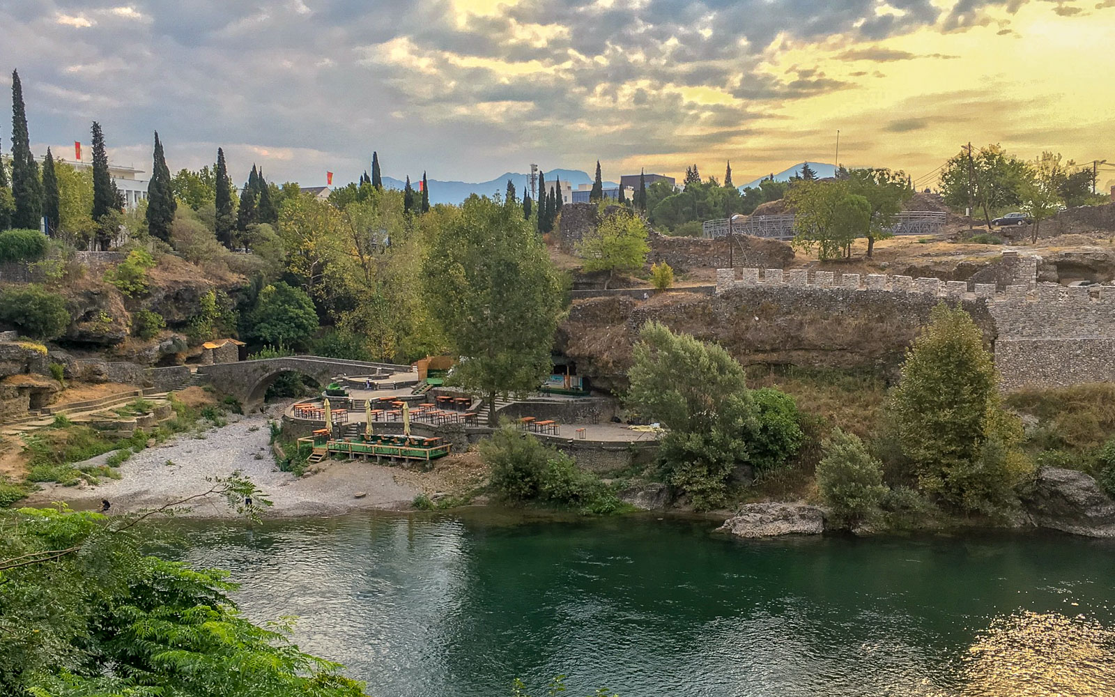 Olimme kaupungissa vain iltapäivästä seuraavaan aamupäivään. Mutta olimme valinneet hotellin mukavalta paikalta, Moraca-joen varrelta. Hotel Podgorica houkutteli paitsi nimellään myös joki- ja puutarhanäkymillään.
