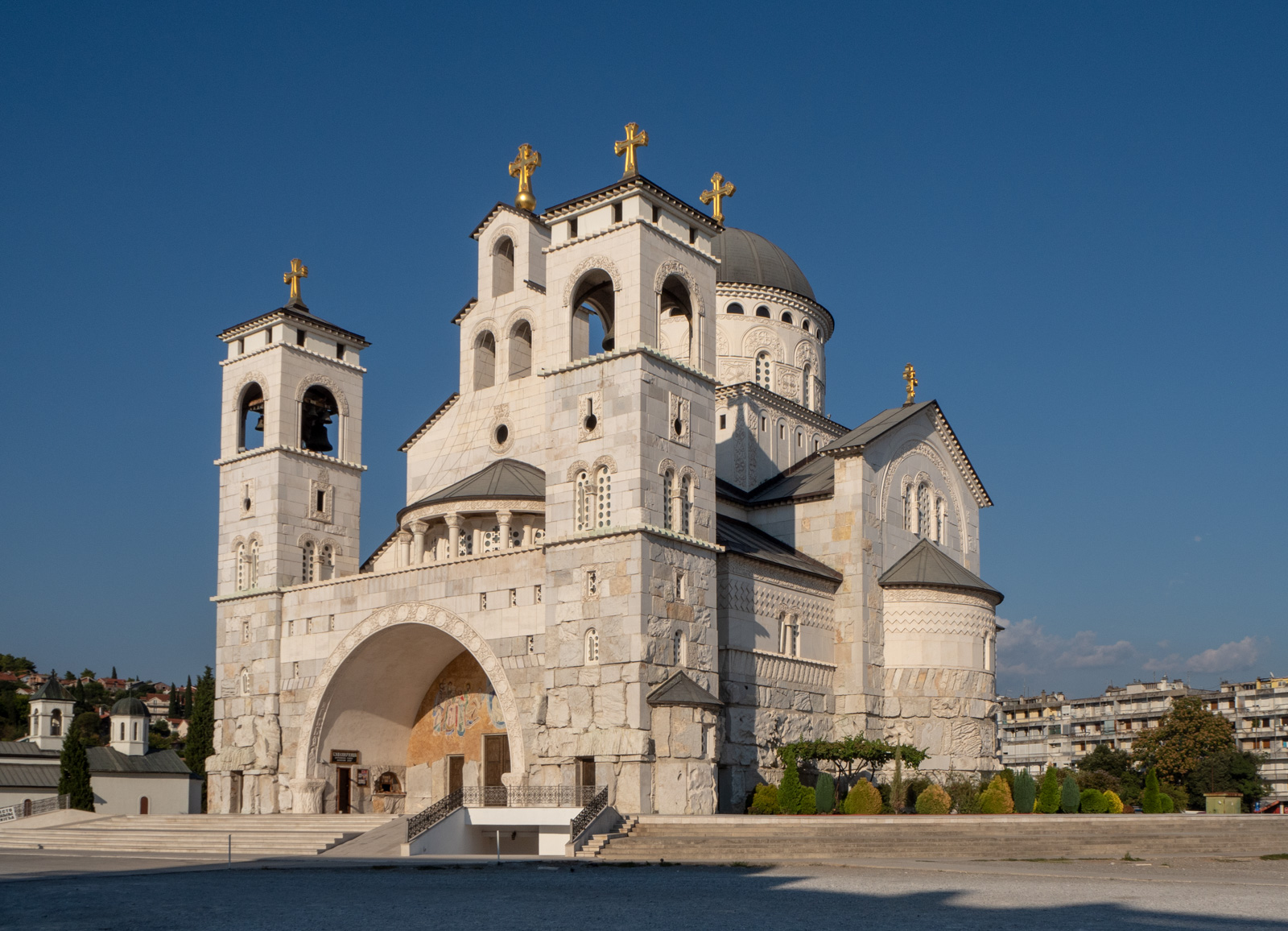 Tripadvisor listaa kaupungin ykkösnähtävyyksiksi Saborni Hram Hristovog Vaskrsenja -kirkon. Myös Millenium- ja Ribnica-sillat olivat listan kärkipäässä ja Ribnican vanha kivisilta näkyi jo hotellin terassilta.