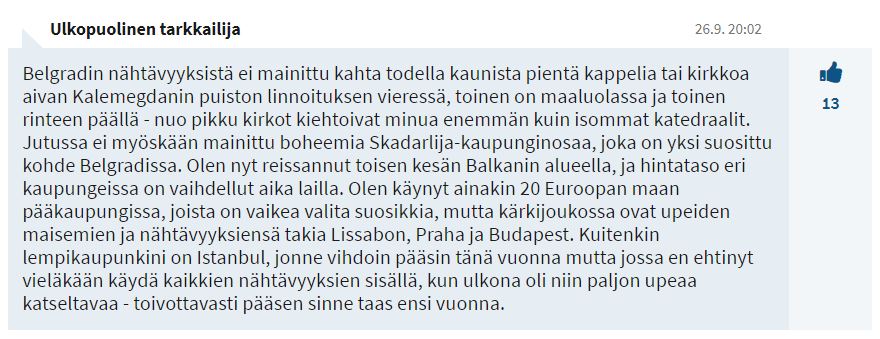 Mutta lue täältä koko juttu – ja myös siihen tulleet kommentit, jos haluat. Ne käsittelivät toisaalta verenpainelääkkeitä, mutta myös yllättävän asiallisesti Euroopan kaupunkikohteita. Matkailuharrastusta kokonaisuutenakaan ei tällä kertaa lytätty yhdessäkään kommentissa.