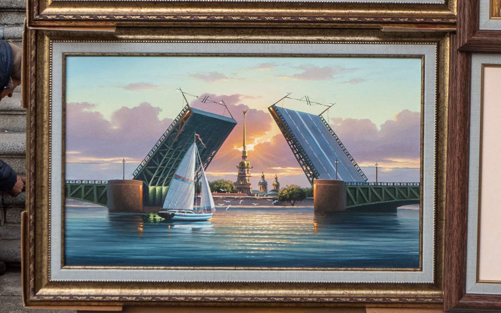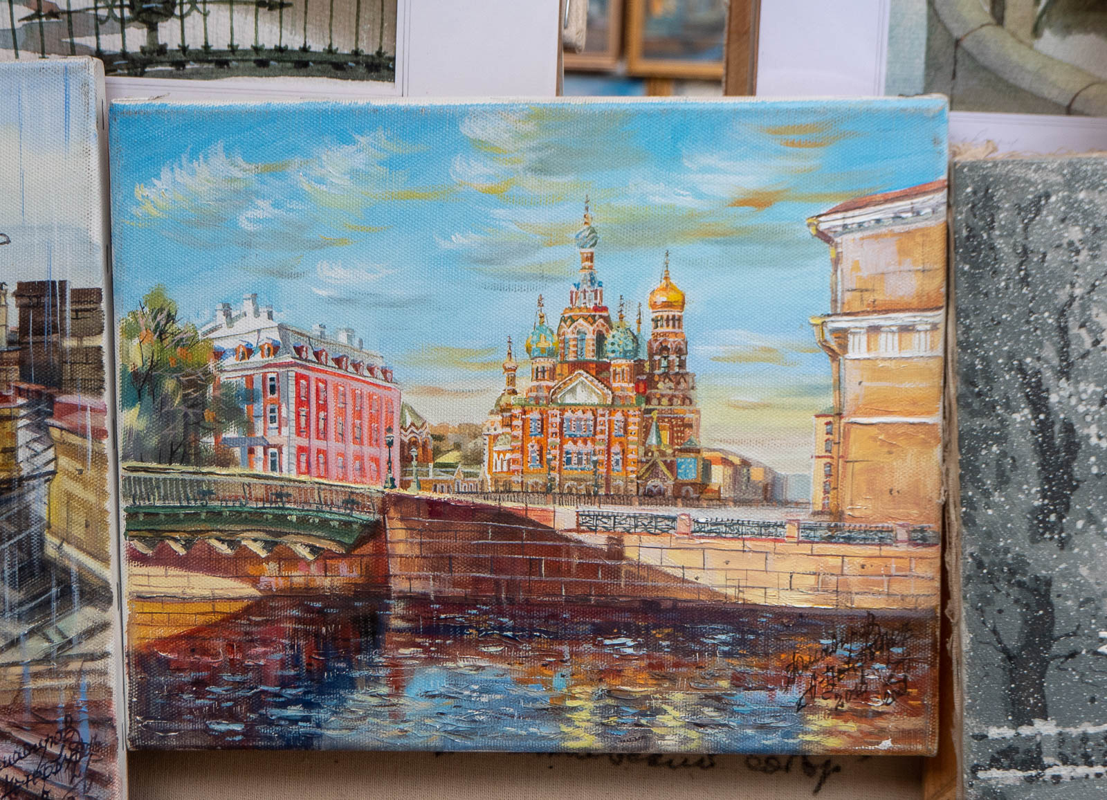 Verikirkon osalta taide pystyikin parempaan kuin me valokuvaajina, jotka emme tällä kertaa voineet oikein valita ajankohtaa tai valaistusta emmekä odottaa remontin valmistumista. Tauluihin oli myös vangittu sitä kesäisen Pietarin ja menneen ajan tunnelmaa, josta puisto jo antoi häivähdyksen.