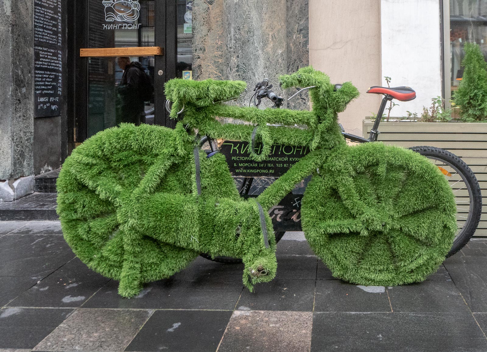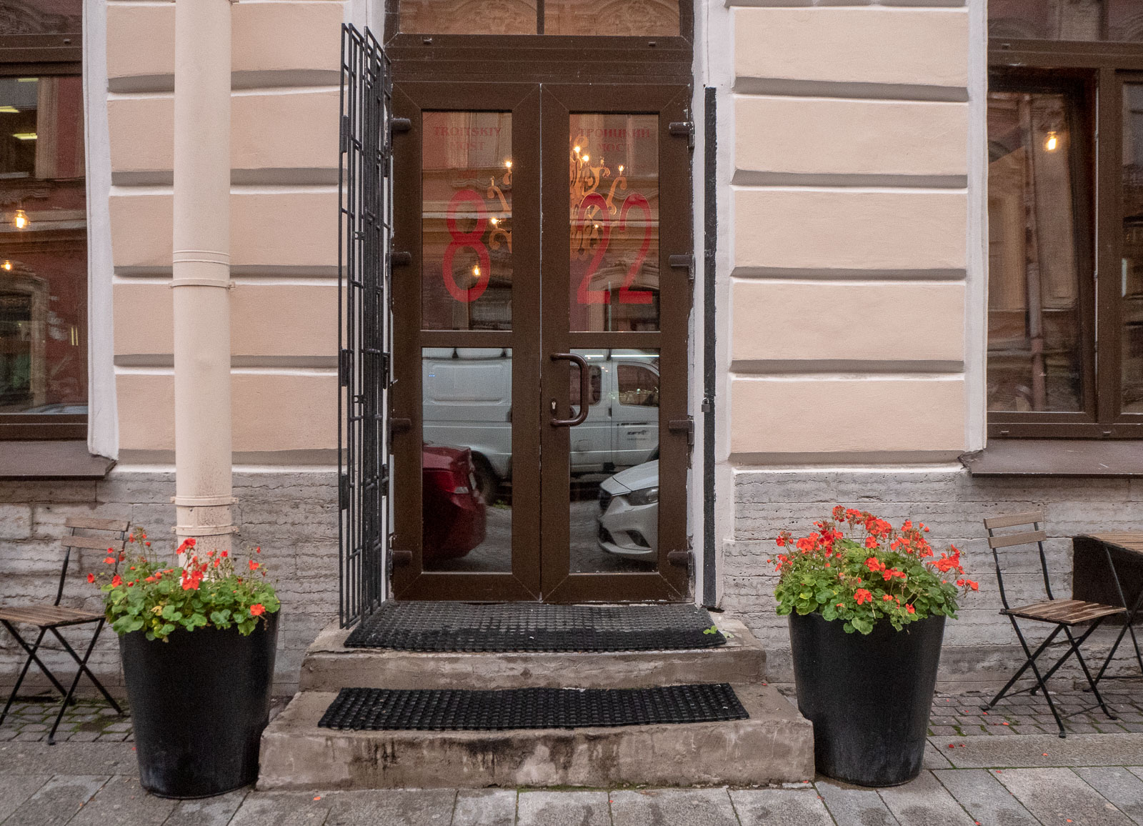 (Myöhemmin asiaan vielä palatessani huomasin, että olimme todellakin tainneet olla väärässä kahvilassa. Ei olisi pitänyt riemastua siitä, että Maps.me löysi kahvilan sen nimellä vaan jatkaa etsintää sen osoitteella. Luultavasti kyse oli saman ketjun kahvilasta, mutta tästä miniversiosta puuttuivat ne kirjahyllyseinät, joita olin ollut etsimässä. Ne olisivat, ehkä, olleet osoitteessa Naberezhnaya Reki Moiki, 30.)