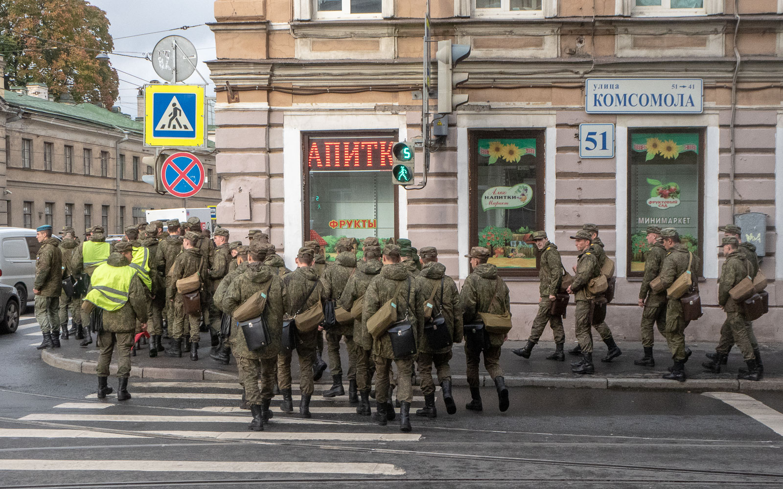 Mutta, loppu hyvin, kaikki hyvin, kamat hotellilta ja reipasta kävelyä Allegro-junan lähtöasemalle. Reipasta ainakin silloin, kun kaduilla sekaan mahtui, sillä syystä tai toisesta vihreäpukuisia sotilaita oli liikkeellä samalla suunnalla sankoin joukoin.