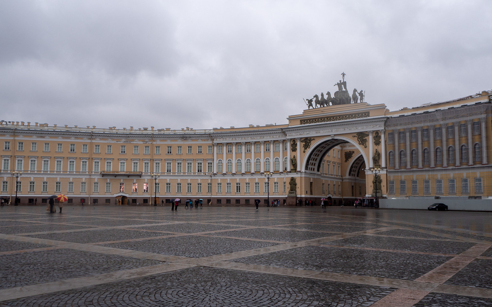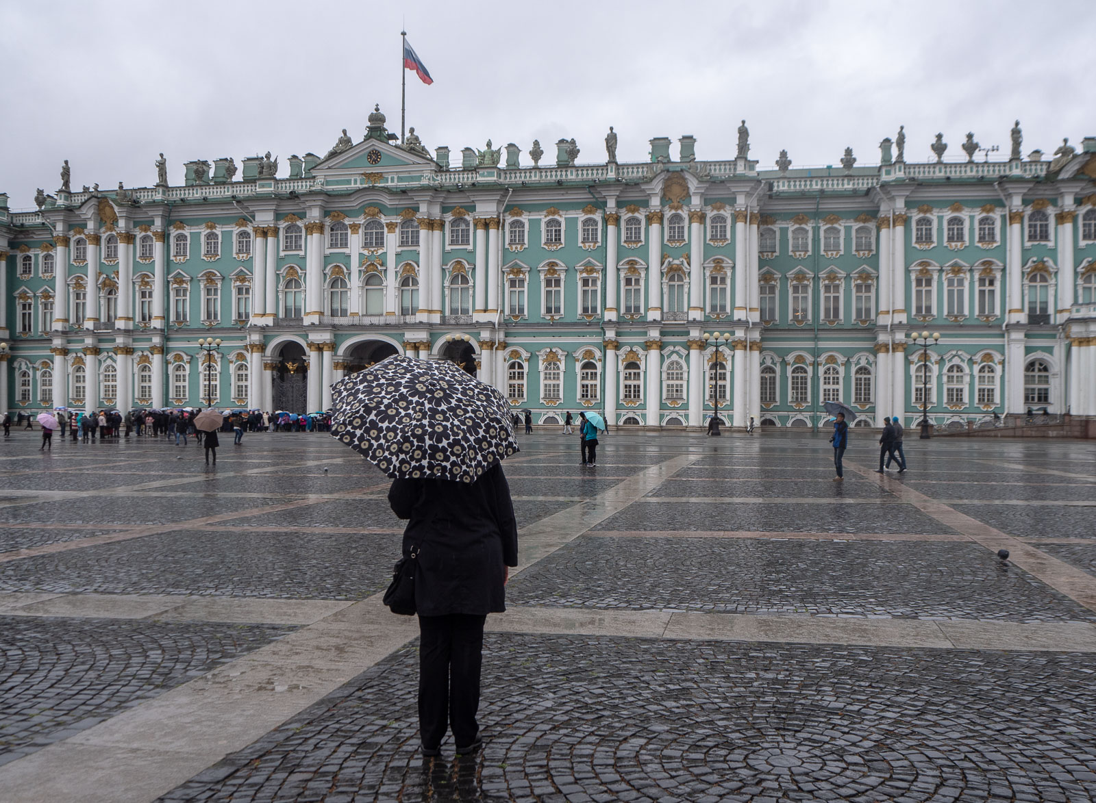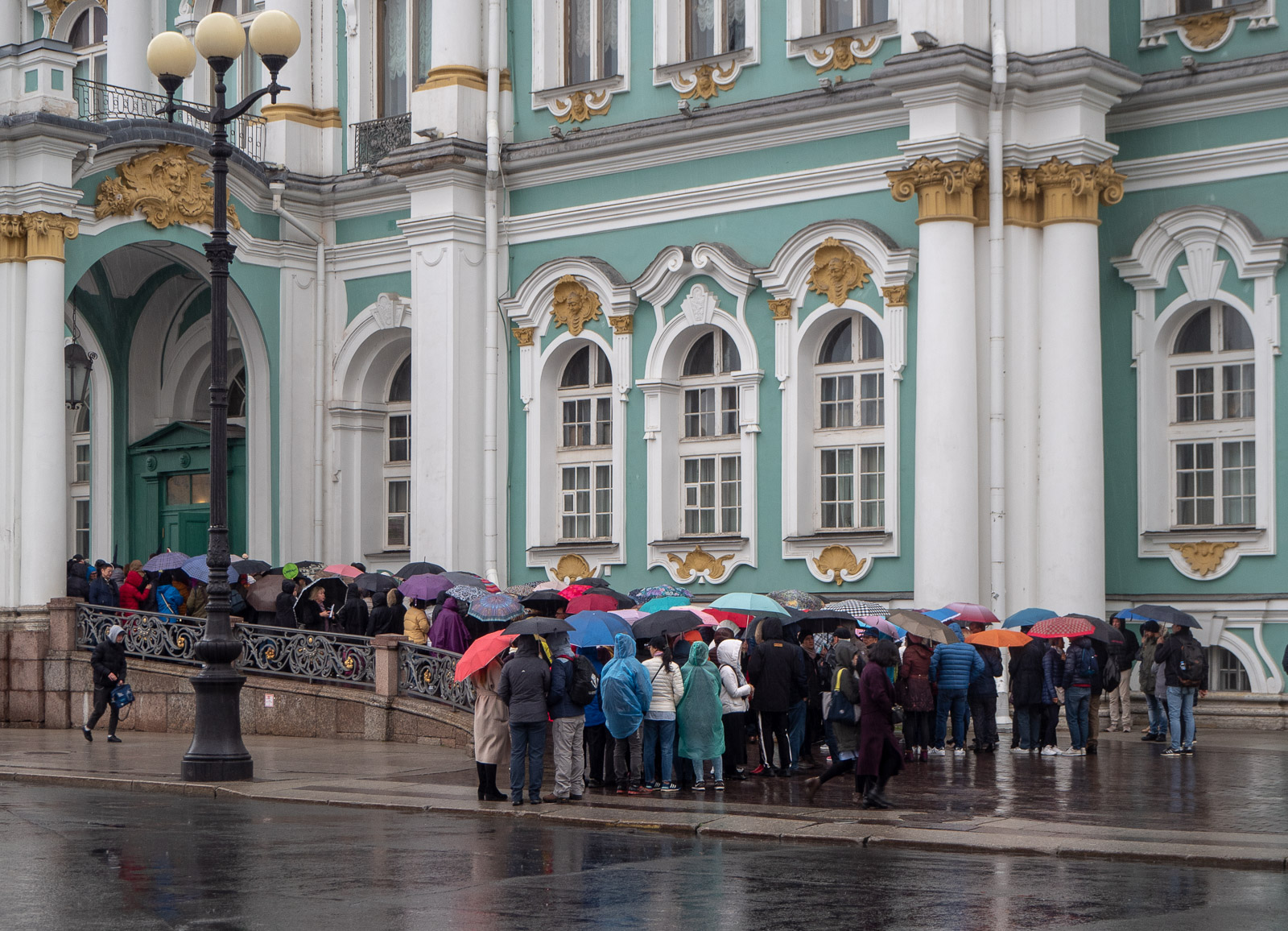 Jos vaikka jotkut muistomme 80- ja 90-luvun Leningradista ja Pietarista olivatkin jo hiukan haalistuneita, niin Eremitaasia eli Talvipalatsia on vaikea unohtaa. Emme halunneet käyttää tällä kertaa aikaa itse museoon, mutta halusimme kuitenkin nähdä rakennuksen, vaikka sitten tällä kertaa pienessä tihkusateessa.