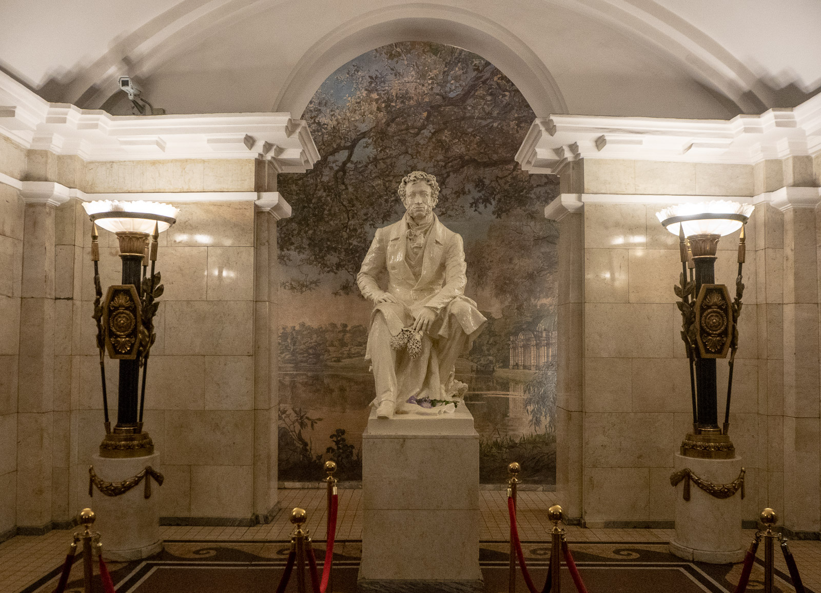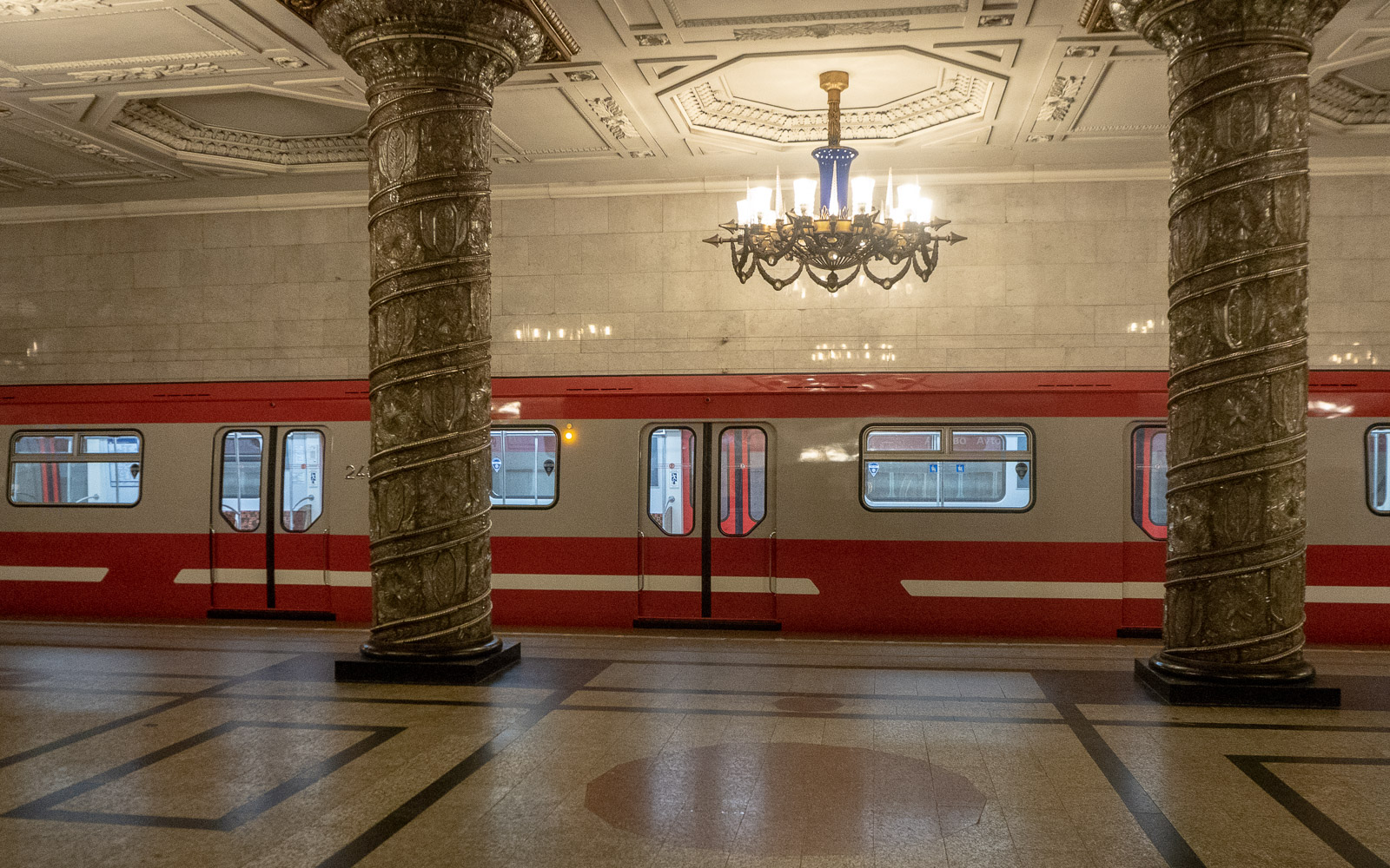 Sade näytti yltyvän hetkeksi, mutta ei se mitään – idealistallamme olikin tutustua vähän lisää Pietarin metroon, joten painuimme Eremitaasin edustan aukiolta lähimmältä metroasemalta, eli Admiralteyskayalta Avtovolle maan alle. Pysähdyimme seuraavilla asemilla, joita kaikkia voimme suositella: Pushkinskaya, Narvskaya, Kirovsky Zavod ja Avtovo, mutta edelleen tänäkin päivänä kukitettu Pushkinin patsas Pushkinskaya-asemalla ja nykyistä elämänmenoa Kirovsky Zavod -asemalla tarkkaileva Lenin sai meiltä parhaat pisteet tunnelmasta. Mosaiikit Avtovolla ja Admiralteyskaylla olivat toki näyttäviä nekin, kuten Avtonon koristellut pylväät.