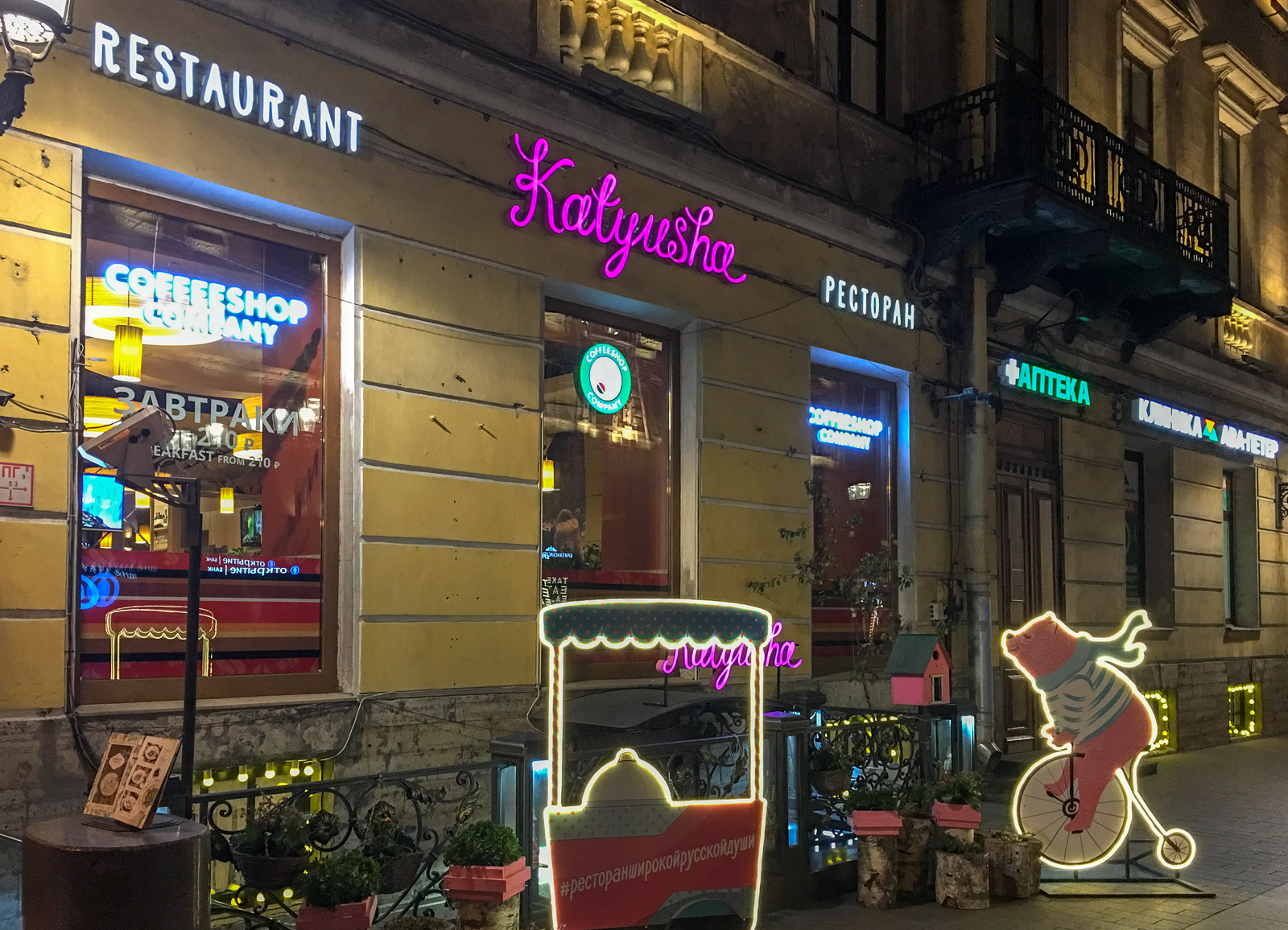 Tapaamme hotellillamme ja kävelemme lähimmälle metroasemalle, joka ei sekään ole ihan lähellä – metroasemien väliset etäisyydet ovat melko pitkiä ja Radisson Sonya ei ole yhdenkään aseman välittömässä läheisyydessä. Saamme pikakurssin siitä miten 100 ruplan seteli vaihtuu kahdeksi metropoletiksi ja 10 ruplaksi (lipun hinta on siis 45 ruplaa) ja matkaamme muutaman pysäkin välin takaisin Gostinyy Dvorin kulmille ja kadun toisella puolella olevaan Katyusha-ravintolaan. Venäläisen ruuan ja Etelä-Venäjältä tulevan valkoviinin parissa aika kuluu kuin siivillä puolin ja toisin kuulumisia päivittäessämme.