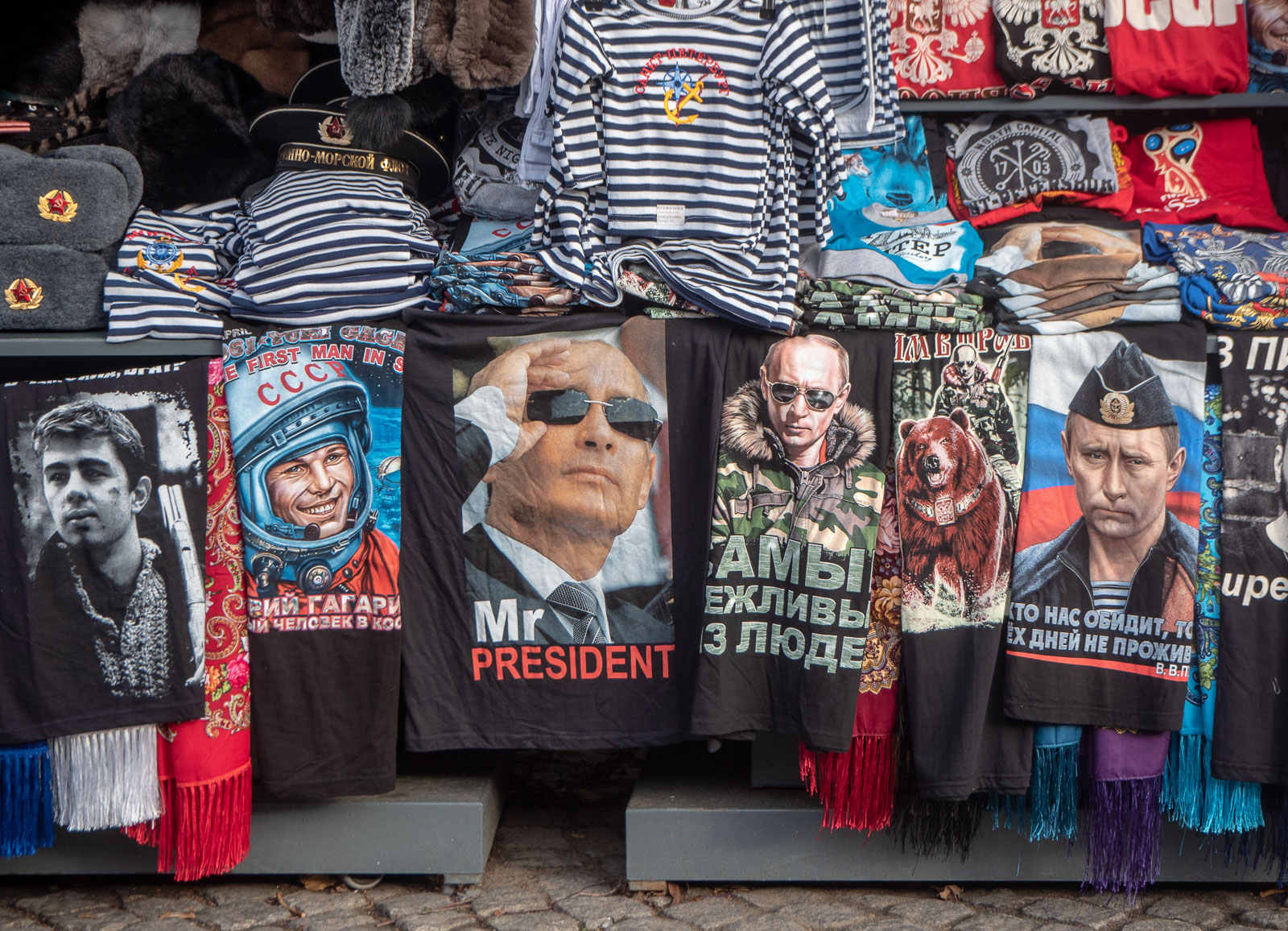Suositun nähtävyyden ympärillä oli tarjolla niin pieniä tauluja kuin t-paitoja Putinin kuvalla.