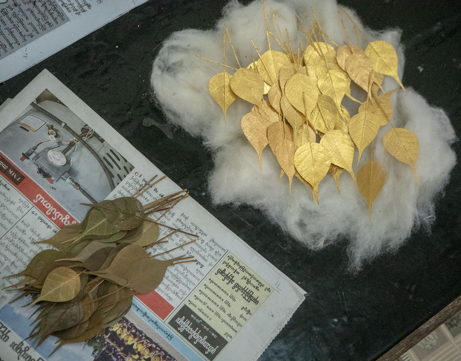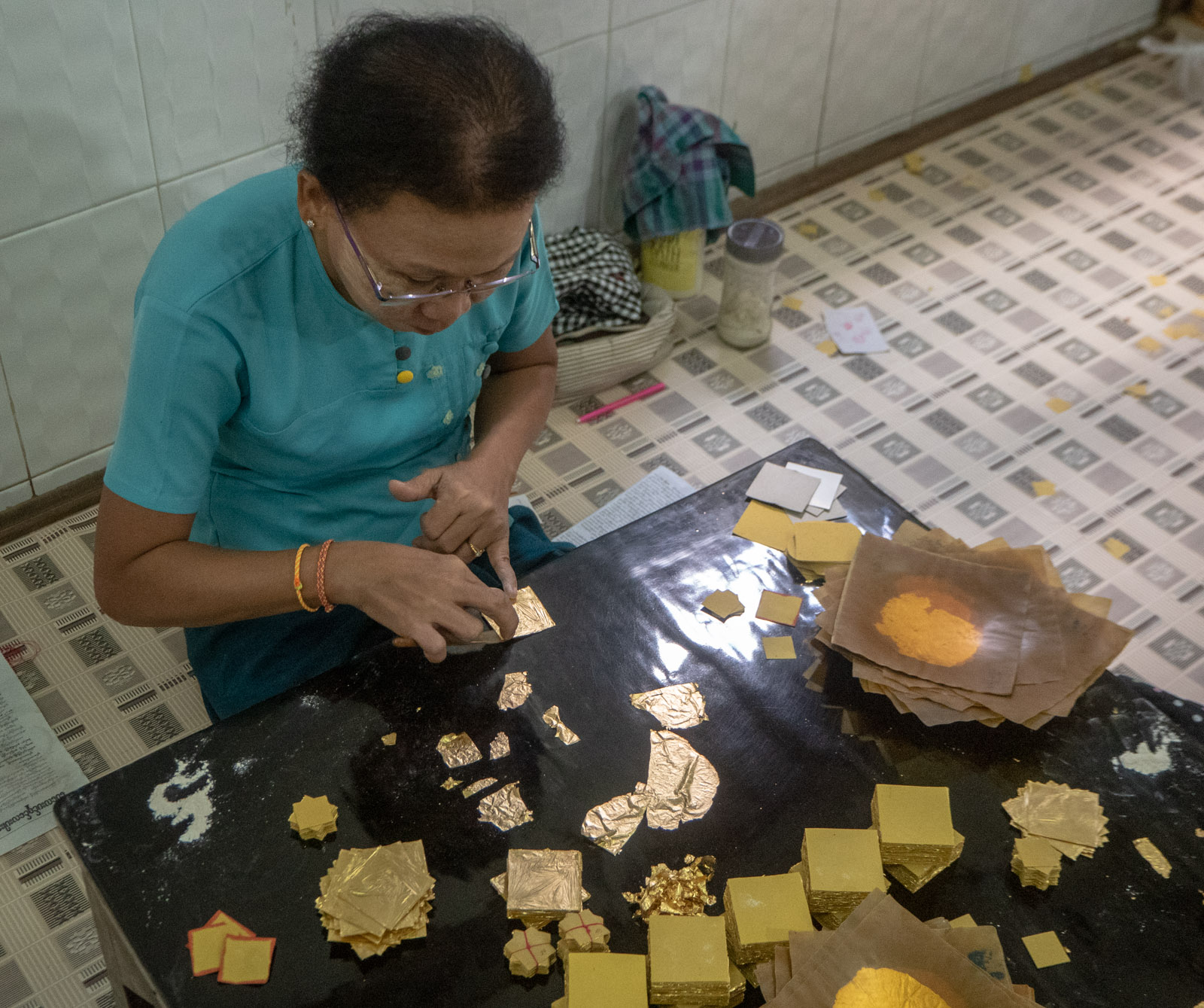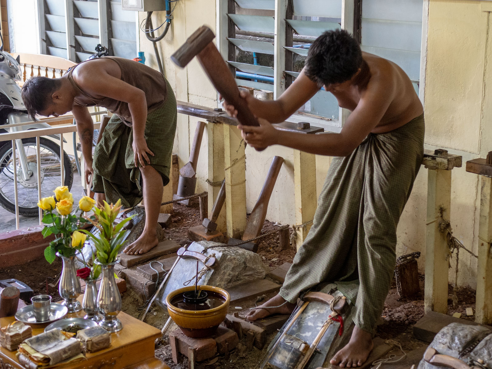 Oikeasti ensimmäinen kohteemme Mandalayssa ei iltapäivällä kaupunkiin saapuessamme ollut U Beinin silta vaan pieni paja. Täällä kultaa hakattiin useammassa vaiheessa aina ohuemmaksi ja ohuemmaksi, kunnes se oli muuttunut paperinohuiksi pieniksi tai vähän isommiksi levyiksi. Näitä levyjä voidaan sitten käyttää vaikka temppelien kattojen päällystämiseen.