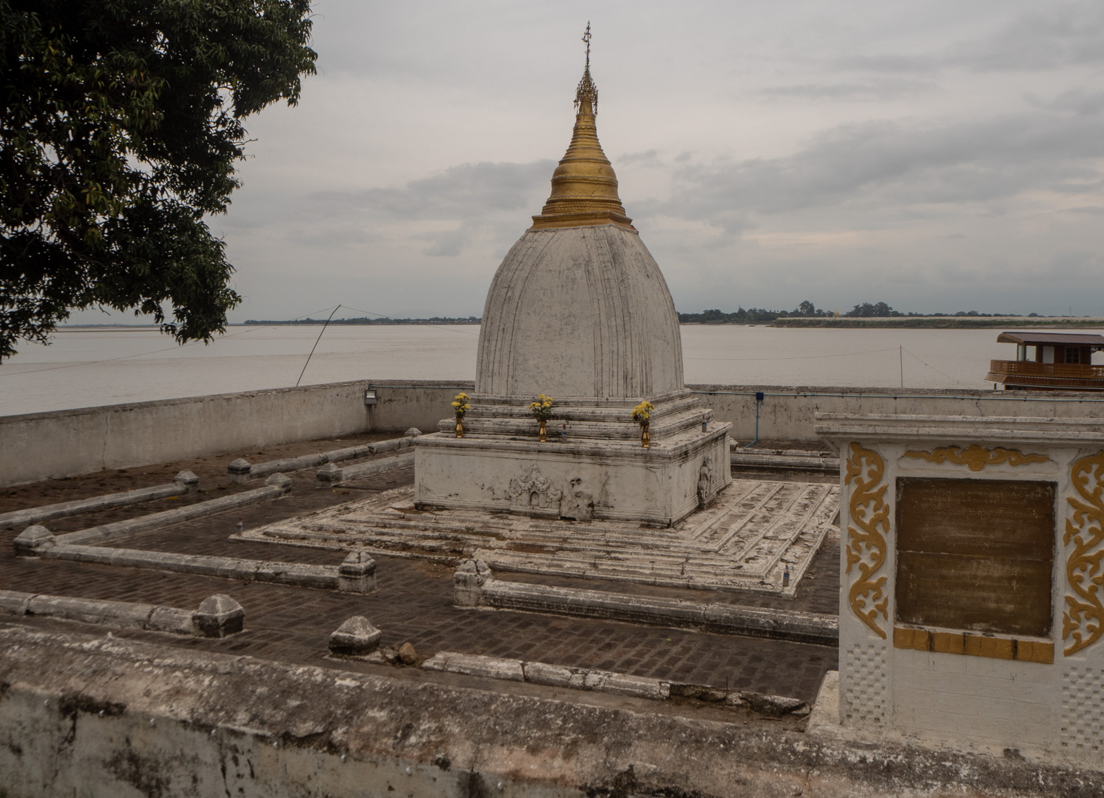 Minguniin matkataan siis Ayeyarwady-joen poikki. Laivojen aikatauluista tai hinnoista ei osaa sanoa, sillä oppaamme oli järjestänyt meille oman laivan – ilmeisesti sekään ei siis maksa maltaita Myanmarissa. Kunhan lankulla kävelystä selvisimme, niin matka Minguniin ja takaisin sujui ihanan ylellisesti omassa rauhassa tämän laivan kannella.