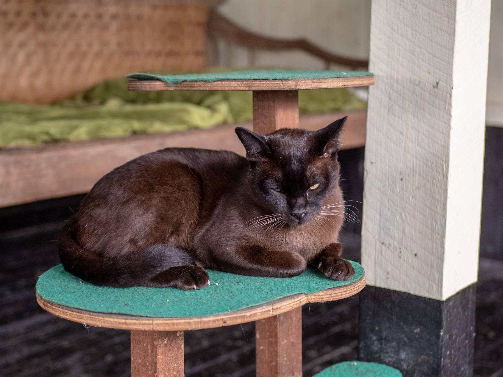 35 burmalaisen kissan kansoittamaan kylään sen sijaan järjestimme aikaa – tämä oli pakko nähdä. Burmalaiset kissat olivat ilmeisesti, opimme, aikanaan kuolemassa sukupuuttoon brittien tuotua maahan omia kissojaan, jotka sitten risteytyivät paikallisten kissojen kanssa siinä määrin, että lopulta Myanmarissa ei enää ollut lainkaan puhdasverisiä burmalaisia. 1930-luvulla maailmasta löytyi enää muutamia Brittein saarille ja Yhdysvaltoihin vietyjä puhdasverisiä rodun edustajia. 2000-luvulla näitä alettiin tuoda takaisin kotimaahansa ja osana tätä projektia tässä hotellissa on pieni saari ja pari rakennusta näille kissoille. Muutamia tunteja päivässä vierailijat saavat käydä näitä katsomassa, kuten kissakahvilassa, paitsi, ettei täällä ole kahvia tarjolla, vain kissoja.