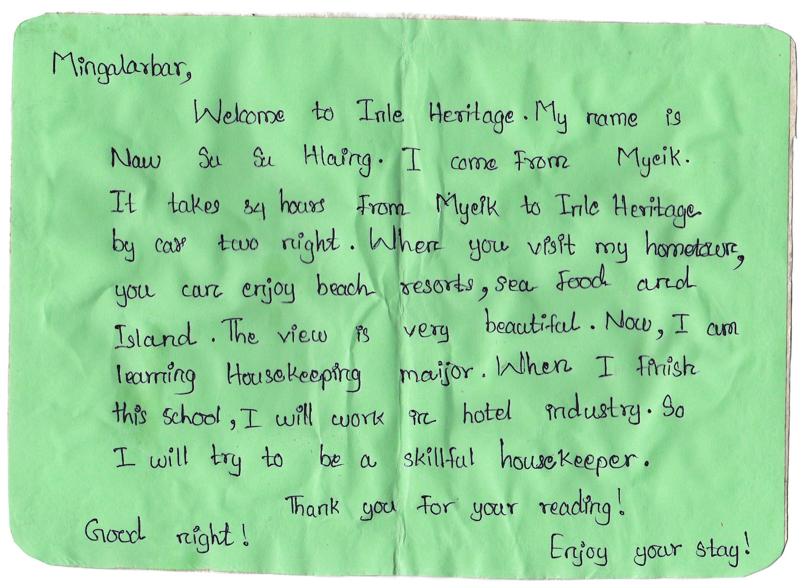 Viimeisenä iltana huoneessamme oli vielä hellyyttävämpi kirje, jossa – olettaisin hän – kertoo hiukan taustastaan ja tavoitteistaan.