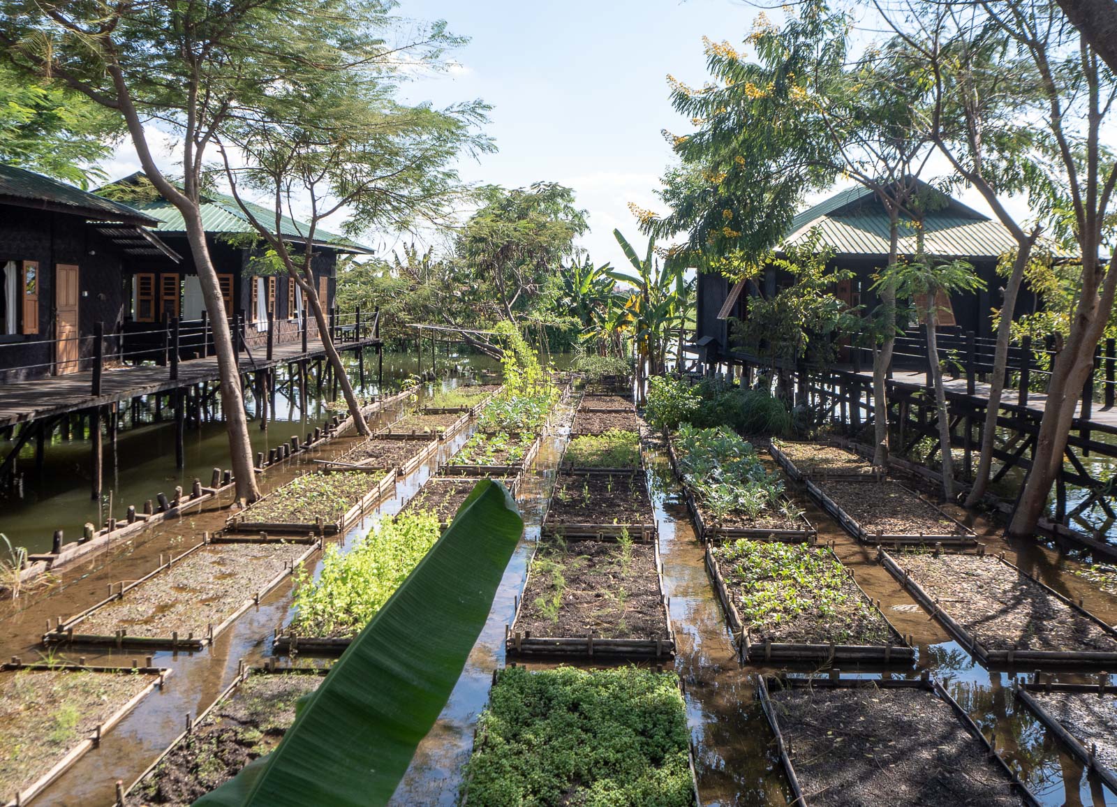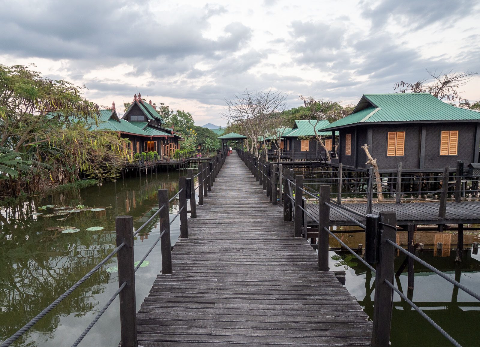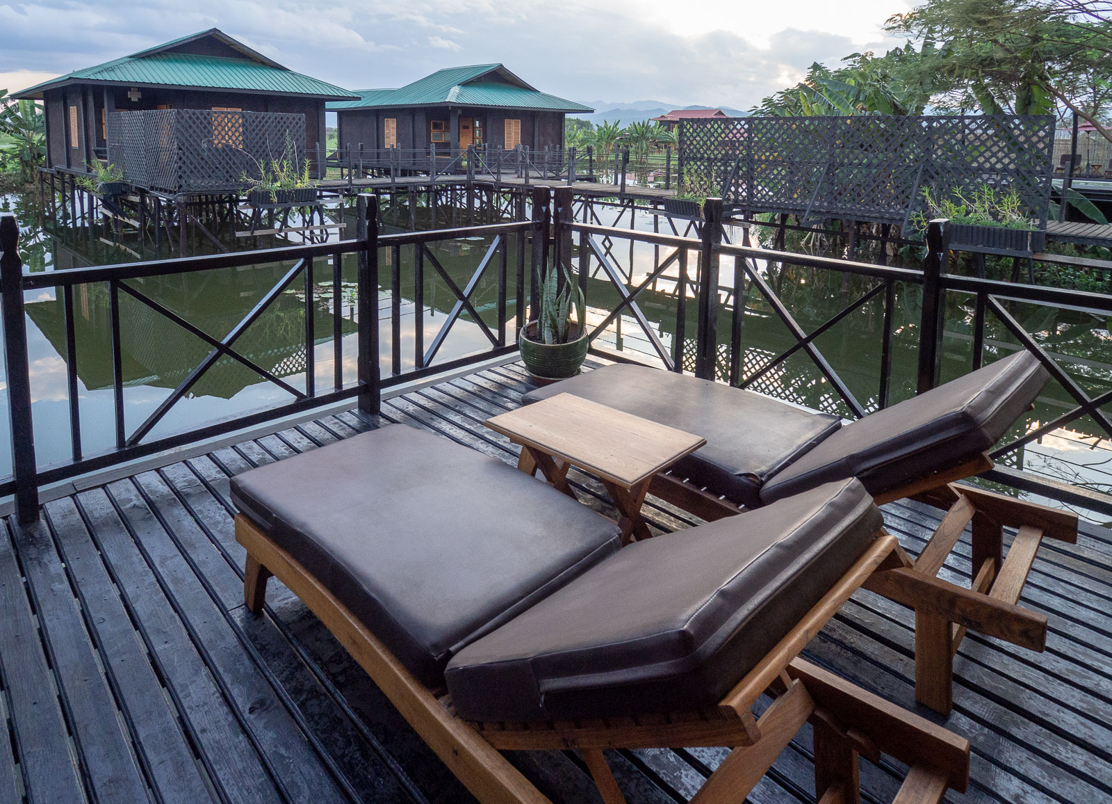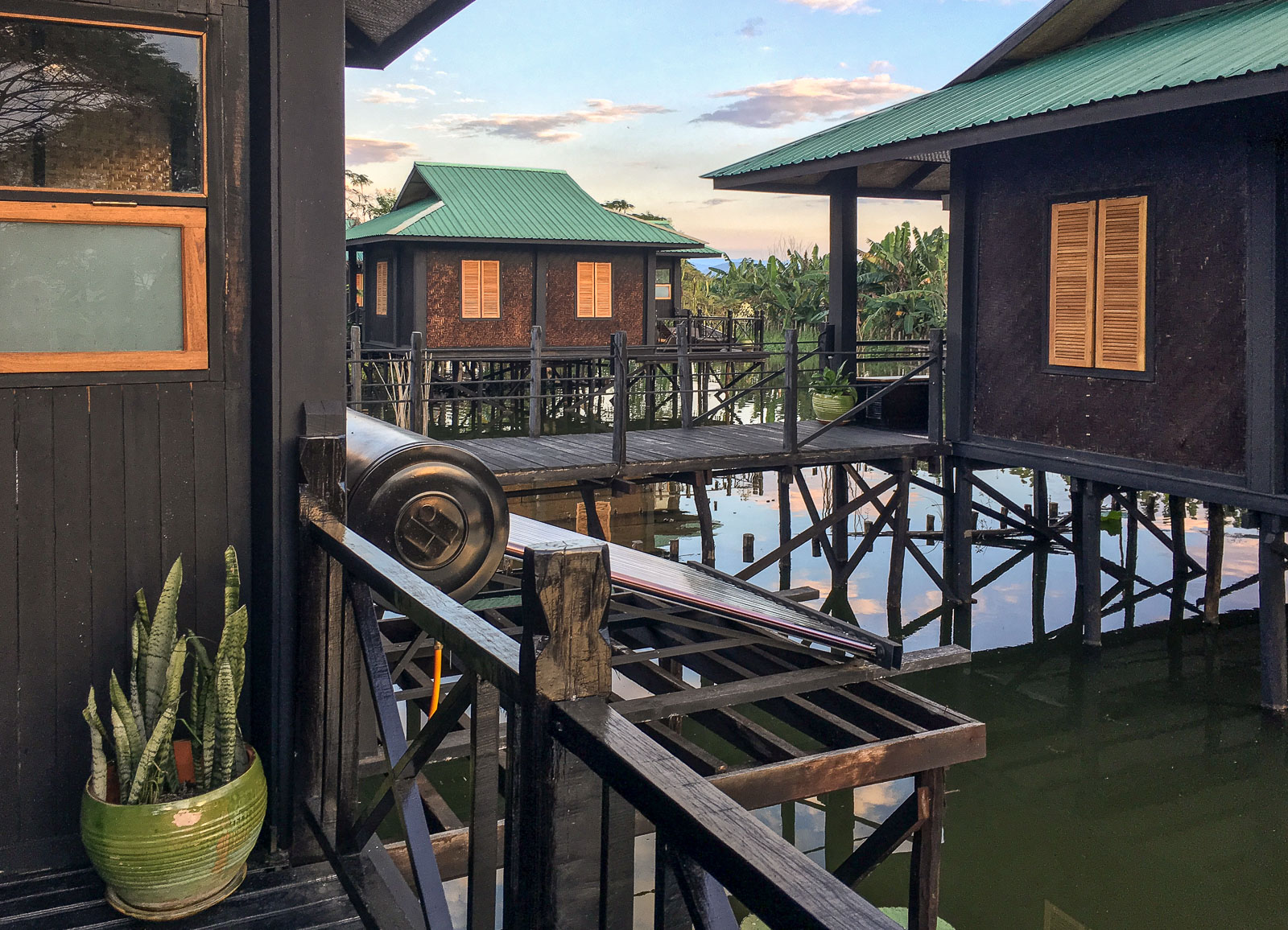 Inle-järvellä asuimme Inle Heritage -nimisessä pienessä hotellissa. Bungaloweja oli alle kymmenen ja ne sijaitsivat kaikki veden päällä. Tietysti, sillä kaikki on Inle-järvellä veden päällä.