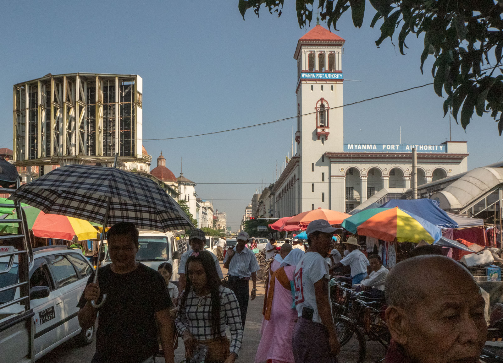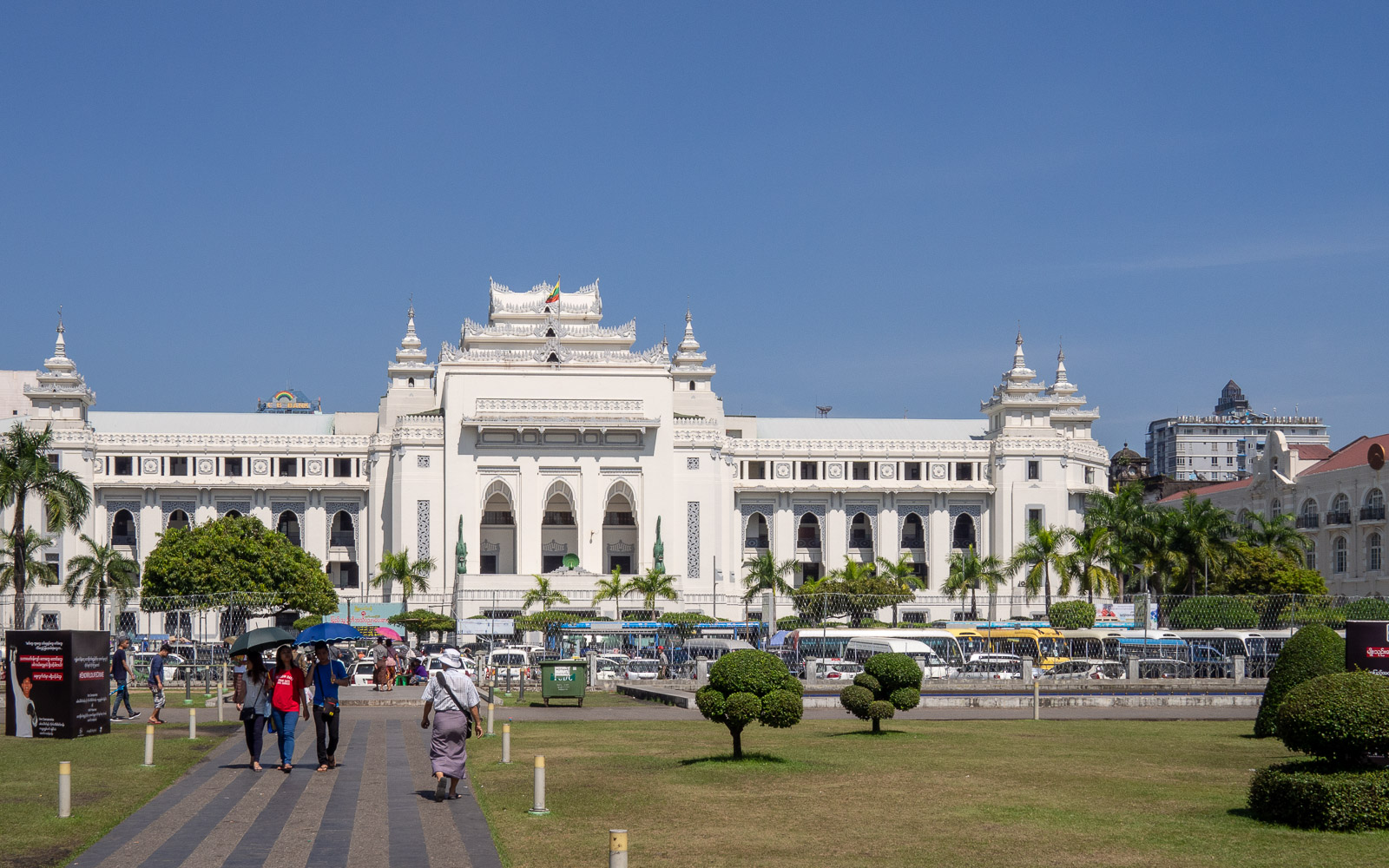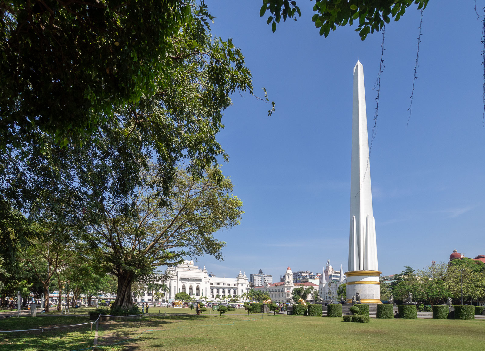 Viimeisenä Yangonin päivänämme poikkesimme vielä kaupungin siirtomaa-aikaisessa keskustassa. Toki jos Yangonin satamakin, josta lautta Dalan puolelle, on osa sitä, mutta kävimme Maha Bandula -puistossa katsomassa Itsenäisyysmonumenttia ja kaupungintaloa. Oppaamme esittelee kaupungintaloa ehkä hiukan kirpeästi: tämä on ainoa alueen rakennuksista, joka on rakennettu myanmarilaiseen tyyliin. Ja kieltämättä, sen vieressä olevat rakennukset, kuten vaikka vanhan oikeustalon kellotorni näyttää länsimaisiin silmiin kauniilta, olihan se meille tuttua tyyliä. Itse asiassa kellotorni tuo mieleeni kellotornin Kanadan Halifaxissa, mutta samaa brittiläistä peruahan ne ovat.