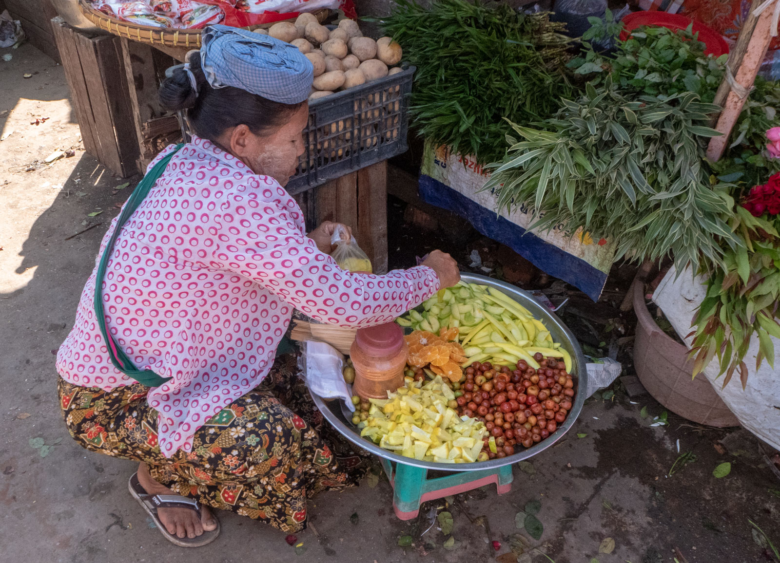 Kiertelimme kuitenkin hetken näitäkin markkinoita. Pysähdyimme muutaman sinänsä ihan kauniin lakkatyön kohdalla, mutta tarveharkinta tuotti lopputuloksen, että emme tarvitse niitä. Katsoimme myös muutamaa taulua sillä seurauksella, että taulukauppias levittää eteemme kymmeniä töitä, mutta poistumme silti paikalta ostamatta mitään: seinäpintamme kotona on vaan jo riittävän täynnä. Täällä markkinoilla ostamattomuus ei meitä häirinnyt samoin kuin Inle-järvellä, sillä kauppa tuntui käyvän hyvin. Ehkä osittain jopa paikallisten tai kotimaisten turistien voimin.