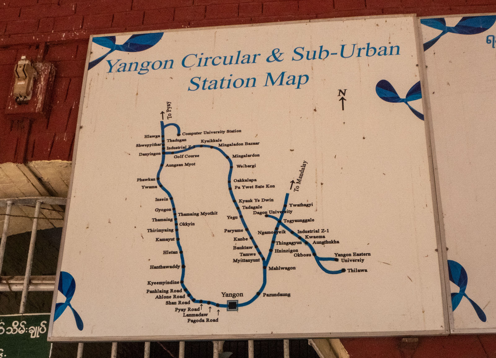 Yangonissa ei ole metroa, mm. siksi mainitsemani mahtavat liikenneruuhkat, mutta kaupunkia kiertää jo englantilaisten aikoinaan rakentama junarata. Juna onkin hyvä vaihtoehto siirtyä paikasta toiseen, jos paikat sattuvat olemaan asemien liepeillä.