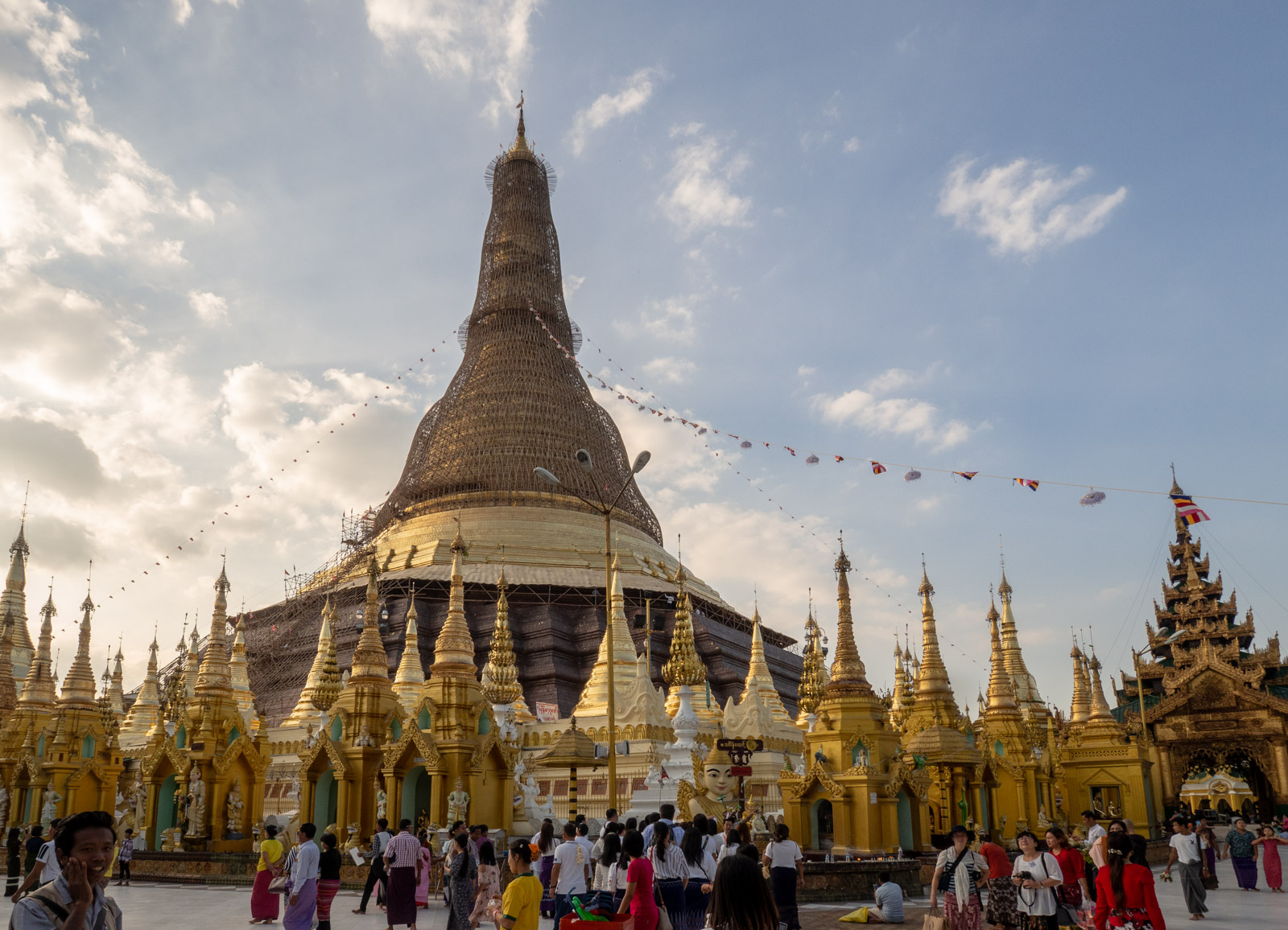 Suuntasimme pagodalla heti saapumisiltanamme – kaikki hienot nähtävyydethän “pitää” nähdä auringonlaskun tai -nousun aikaan. Oppaamme arveli, että jos lähdemme hotelliltamme klo 15, niin meillä olisi vielä aikaa poiketa Bogyoke Aung Sanin markkinoilla ennen sitä, mutta odotettuamme iltapäivän liikenteessä yhden(!) ison tien ylitystä ehkä vartin ehdotimme U-käännöstä ja suuntasimme suoraan pagodalle, jotta meille jäisi siellä enemmän aikaa ennen pimeän tuloa.