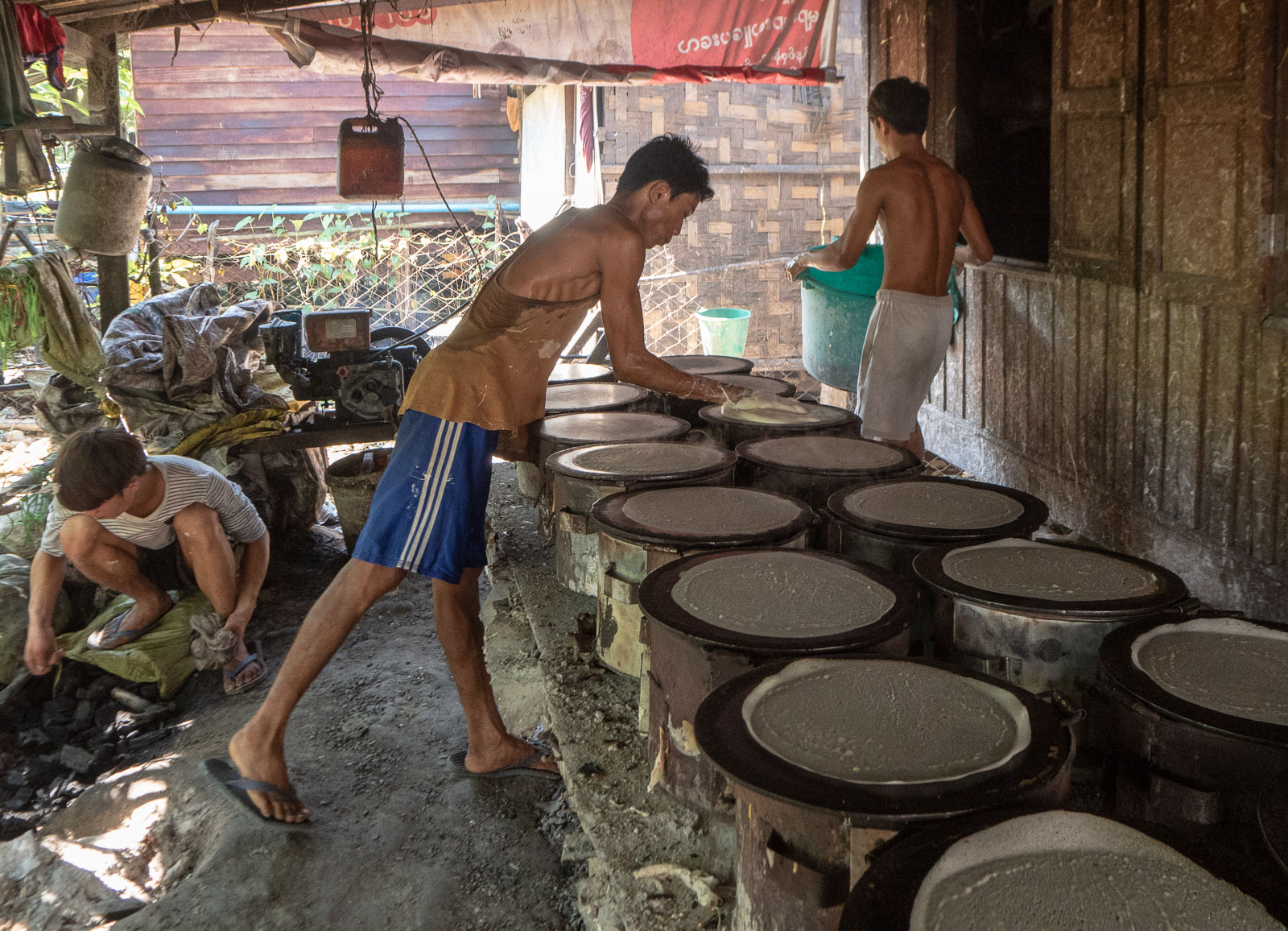 Me kuitenkin asetumme mukavasti meille valittujen kolmen polkupyöräriksan kyytiin, siis oppaamme ja me, ja kyläkierroksemme alkaa. Kohteiksi on valikoitunut kierrätysmateriaaleista erilaisia pieniä esineitä valmistava kauppa, Chu Chu Yangon, ohuen ohuita mm. kevätkääryleissä käytettäviä taikinakuoria valmistava nyrkkipaja ja paikallinen teehuone. Mutta melkein näitä kohteita kiinnostavampaa on tarkkailla vastaan tulevaa liikennettä ja elämää pienten talojen pihapiirissä.