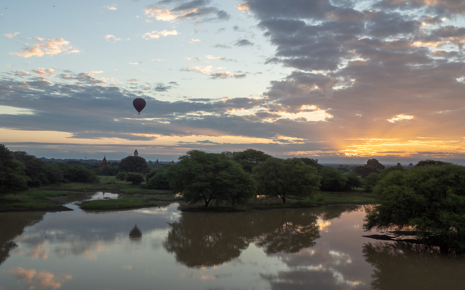 Paras vaihtoehto pagodien ihasteluun auringonnousun aikaan on nousta niiden yläpuolelle kuumailmapallolla. Muutamat Baganissa viettämämme päivät olivat kuitenkin pilvisiä ja ensimmäinen tilaisuus siihen olisi ollut vasta lähtöaamunamme ja lentomme Hehon kautta Inleen lähti jo klo 10, joten aikataulu olisi mennyt vähintään tiukaksi. Emme kuitenkaan jääneet harmittelemaan tätä, olimmehan lentäneet kuumailmapallolla jo aikaisemmin, ja toisaalta palloja oli kiva katsoa auringon noustessa Ayeyarwaddy-joen rannalla olevalla pienellä mäellä. Kiva, vaikka sekin vaati lähdön hotellilta jo 5:15.