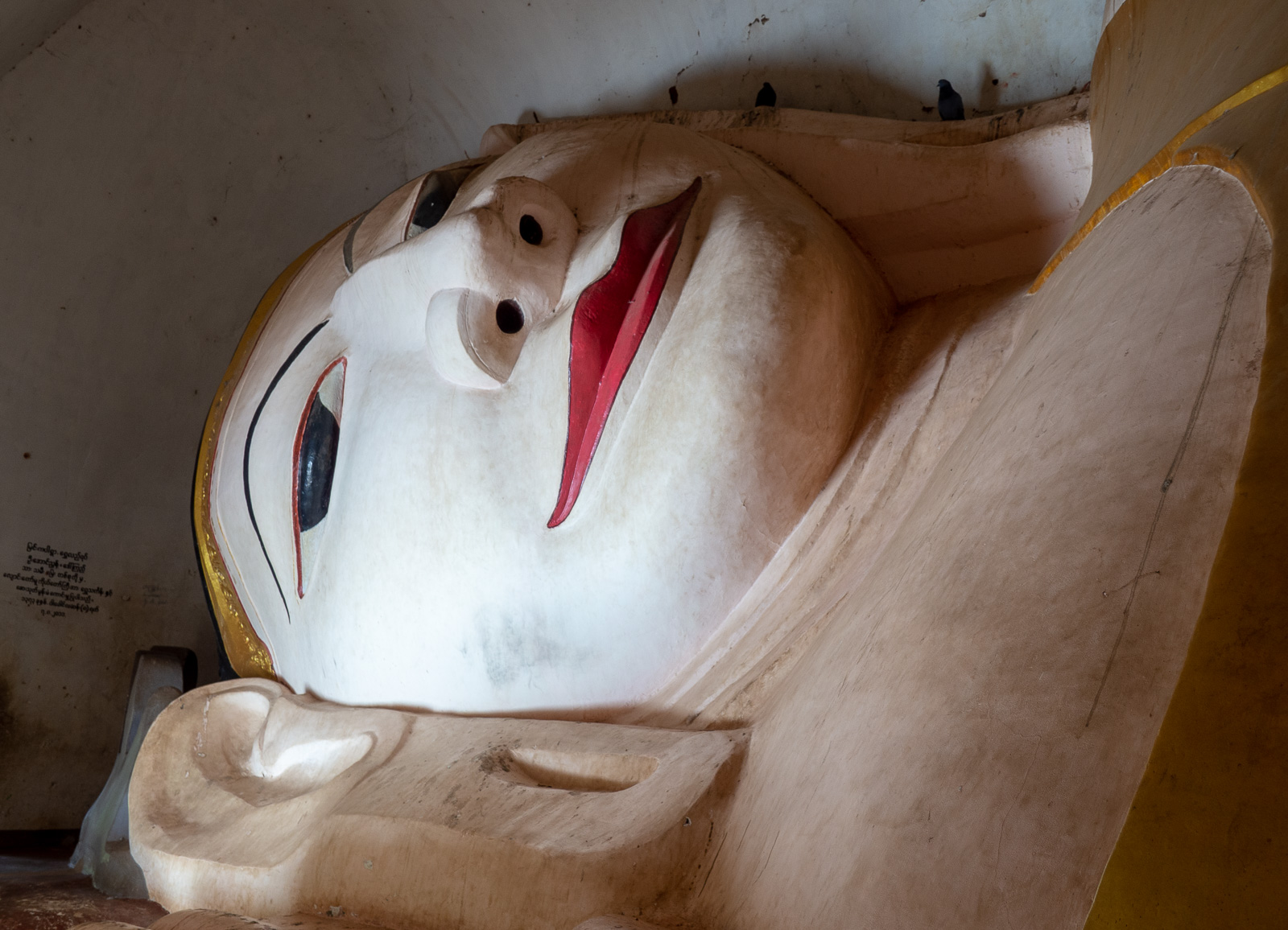 Mutta temppelin sisällä olevat buddhat, niin istuvat kuin iso makaava buddha, jonka näkemiseksi on pujoteltava kapeassa käytävässä, tekevät sen. Kooltaan Manuhan makaava buddha ei ihan vedä vertoja Wat Phon jättimäiselle makaavalle buddhalle, mutta toisaalta täällä ei ole muita turisteja kokemusta häiritsemässä.