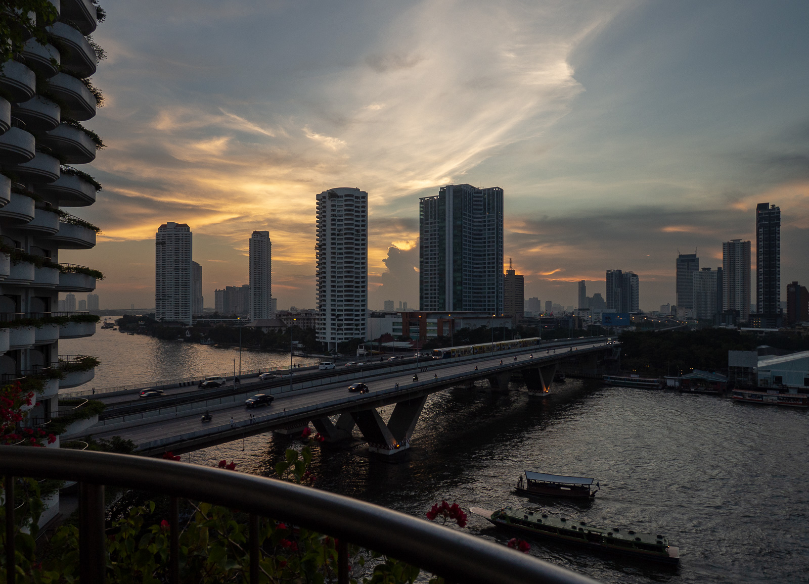 Huoneemme oli 8. kerroksessa ja siinä oli parveke joelle päin. Chao Phraya -joen liikennettä olikin mukava tarkkailla omalta parvekkeelta silloin kun ei jaksanut itse siihen osallistua. Illalla joelle päin aukeava näköala oli luultavasti yhtä hyvä kuin näköalat Bangkokin kattobaareista. Yksi näistä, Lebua-hotellin Sirocco, oli parin korttelin päässä hotelliltamme ja kävimme lyhyesti tsekkaamassa sen yhtenä iltana, mutta tulimme siihen tulokseen, että ei meidän tänne ainakaan näköalan takia kannata jäädä.