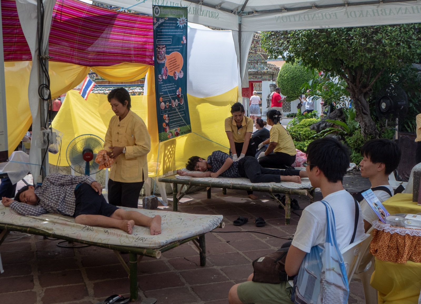 Temppelin alueella on myös hierontakoulu, jonka oppilaat tarjoavat erilaisia hierontoja ehkä edulliseenkin hintaan, mutta emme jaksaneet innostua hieronnasta muiden turistien uteliaiden silmien alla.