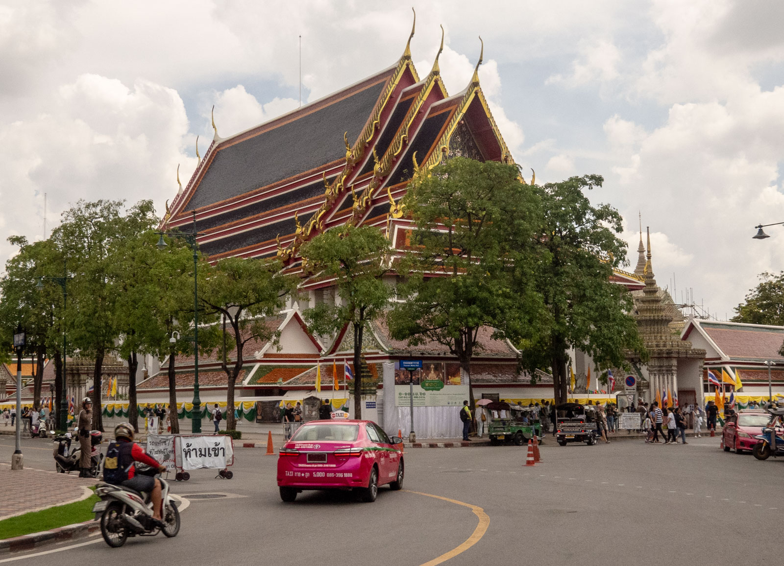 Matkaa Grand Palacelta Wat Phon temppelille on ehkä kilometrin verran. Ei kuitenkaan niin pitkälti etteikö sitä helteessäkin laiskasti kävelisi. Matkalla voi opiskella vaikka miten välttää tyypillisimmät turistihuijaukset Thaimaassa tai pysähtyä ansaitulle tauolle kuninkaiden kuvia katselemaan.