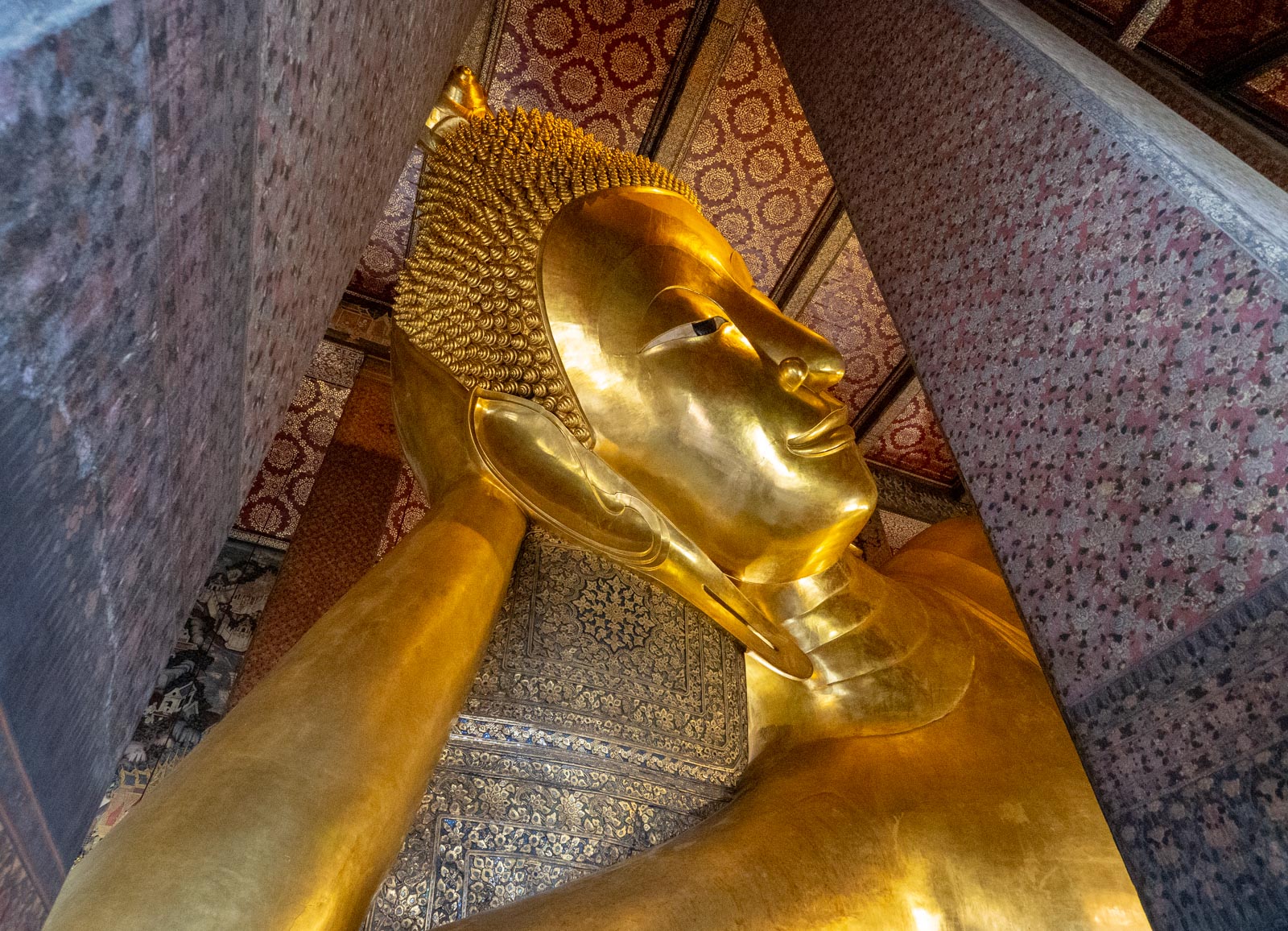 Seuraava kohteemme oli Wat Pho ja sen suuri makaavan buddhan patsas. Maailman suurin makaava buddha se ei ole, mutta mukana useimmilla maailman kymmenen suurimman makaavan buddhapatsaan listoilla.