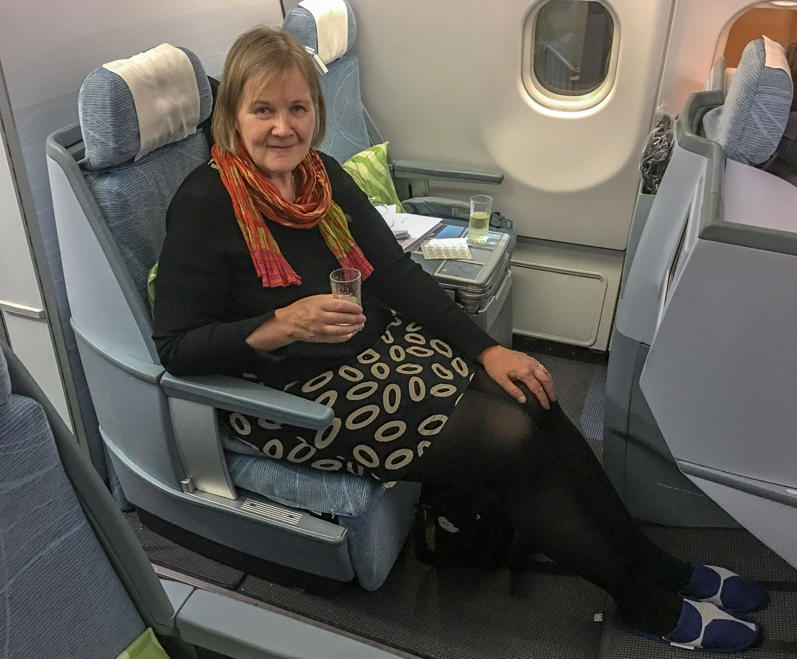 Kannattiko upgradet? Osaltamme kyllä, sillä pidän nykyisin reilua jalkatilaa pitkillä lennoilla välttämättömyytenä, josta ei tingitä, jos siihen rahalla voi vaikuttaa. Tilan lisäksi vastamelukuulokkeet olivat hintansa arvoisia (omia ei ollut mukana tällä kertaa, seuraavalla kerralla ehkä jo on). Pussukoita emme erityisesti arvostaneet. Tohvelit businessluokassa olivat kyllä kivat. Ruokakin on vähän niin ja näin: ei se erityisesti yölennoilla ole meille kovin tärkeä asia, mutta hyvä palvelu kyllä sai hyvälle mielelle.