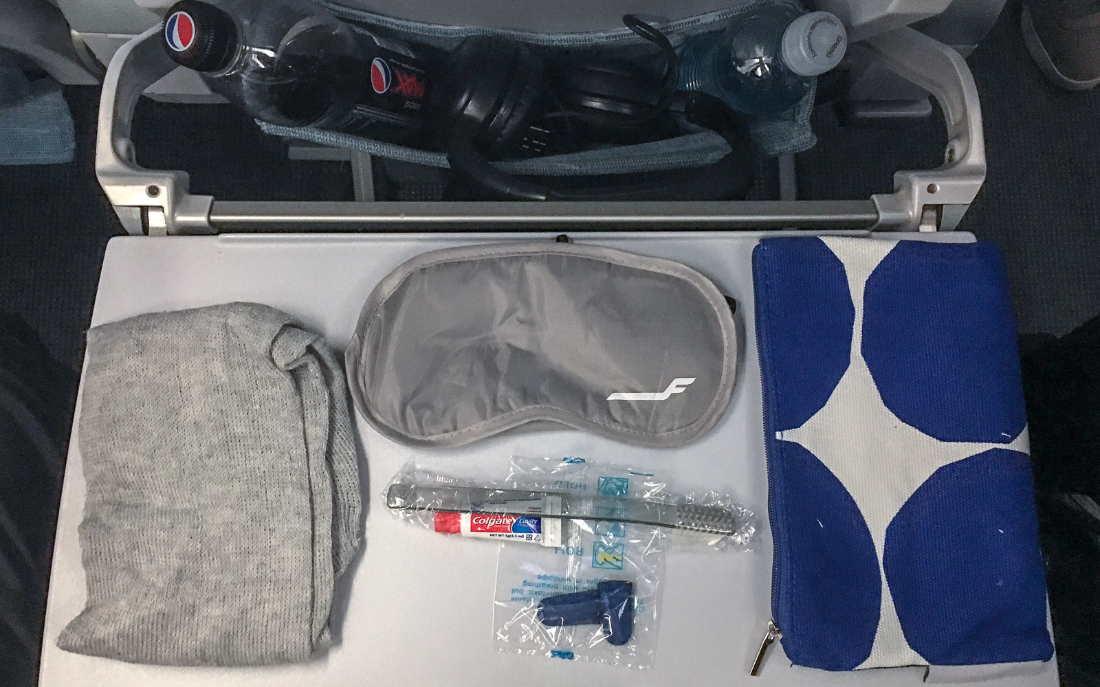 Vastamelukuulokkeet olivat mieleen, samoin paikka koneen etuosassa ja jalkatila. Pussukasta ja sen sisällöstä ei olisi ollut niin väliä eikä wifiäkään tuntunut yölennolla erityisen tarpeelliselta.