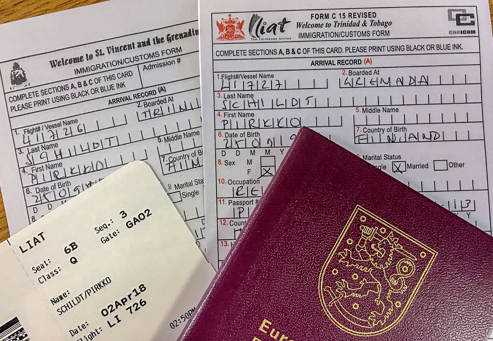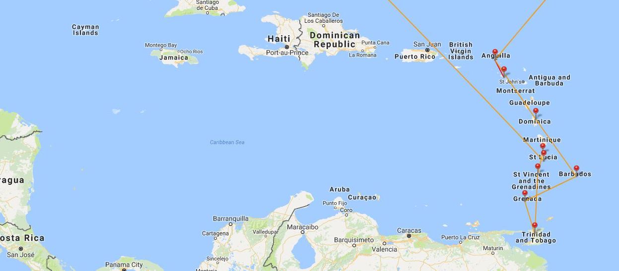 Keväinen reittimme oli Sint Maarten/Saint Martin – Dominica – Barbados – Grenada – Saint Vincent ja Grenadiinit – Saint Lucia. Lisäksi teimme Sint Maartenilta päiväretken Saint Kitts & Nevisille. Grenadalta ei ihan suoraa lento Saint Vincentille osunut kohdalle, joten poikkesimme välilaskun verran myös Trinidadin saarelle.