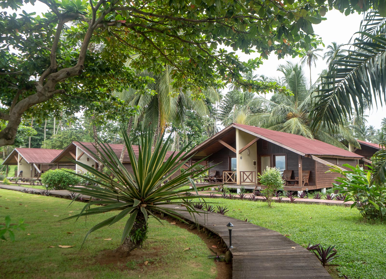 Hotellialue vaikutti ihan viihtyisältä ja palvelu ainakin allasbaarissa oli hyvää. Huoneet näyttivät olevan puutarhamaisessa maisemassa bungalow-tyyppisissä rakennuksissa ehkä pari huonetta samassa rakennuksessa. Luultavasti hotelli on ihan hyvä, mutta jotenkin jäin miettimään sen sijaintia. Jos São Tomélla päätyy varaamaan huoneen täältä, niin on hyvä ymmärtää, että muu saari on ½ tunnin venematkan ja pääkaupunki vielä parin tunnin automatkan päässä, eli ehkä tämä hotelli on parhaimmillaan niille, jotka aikovat viettää koko lomansa tuon isohkon uima-altaan liepeillä.