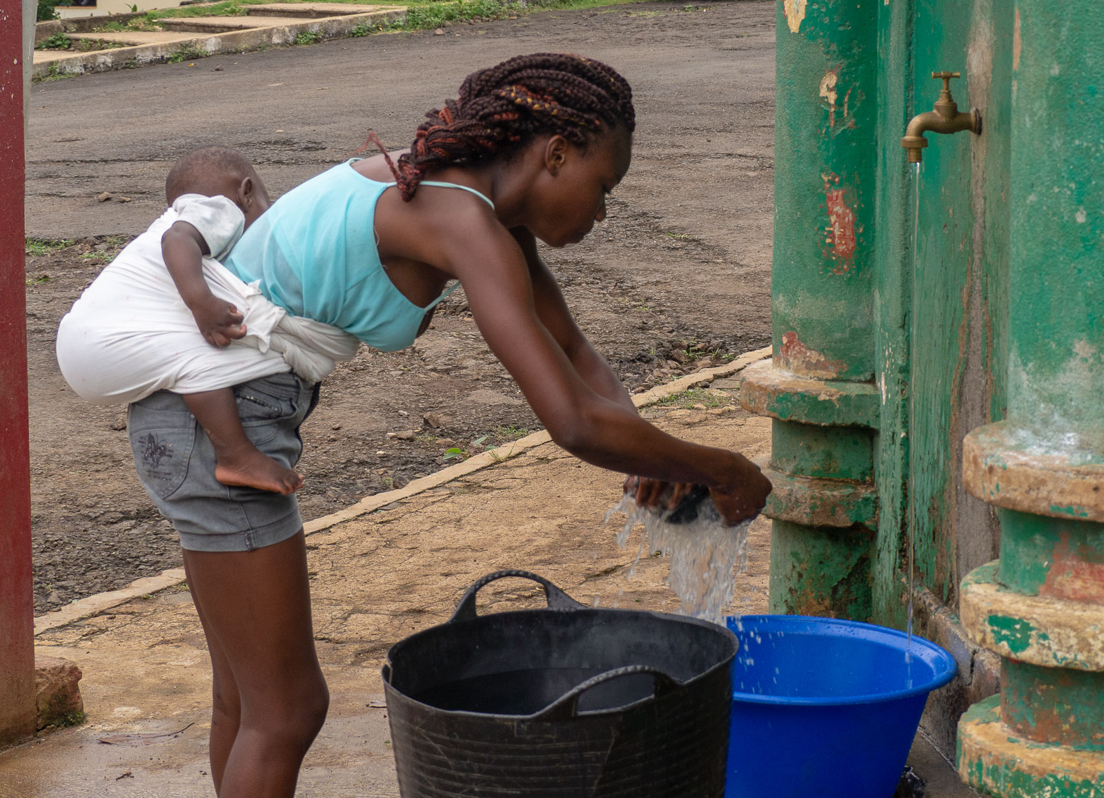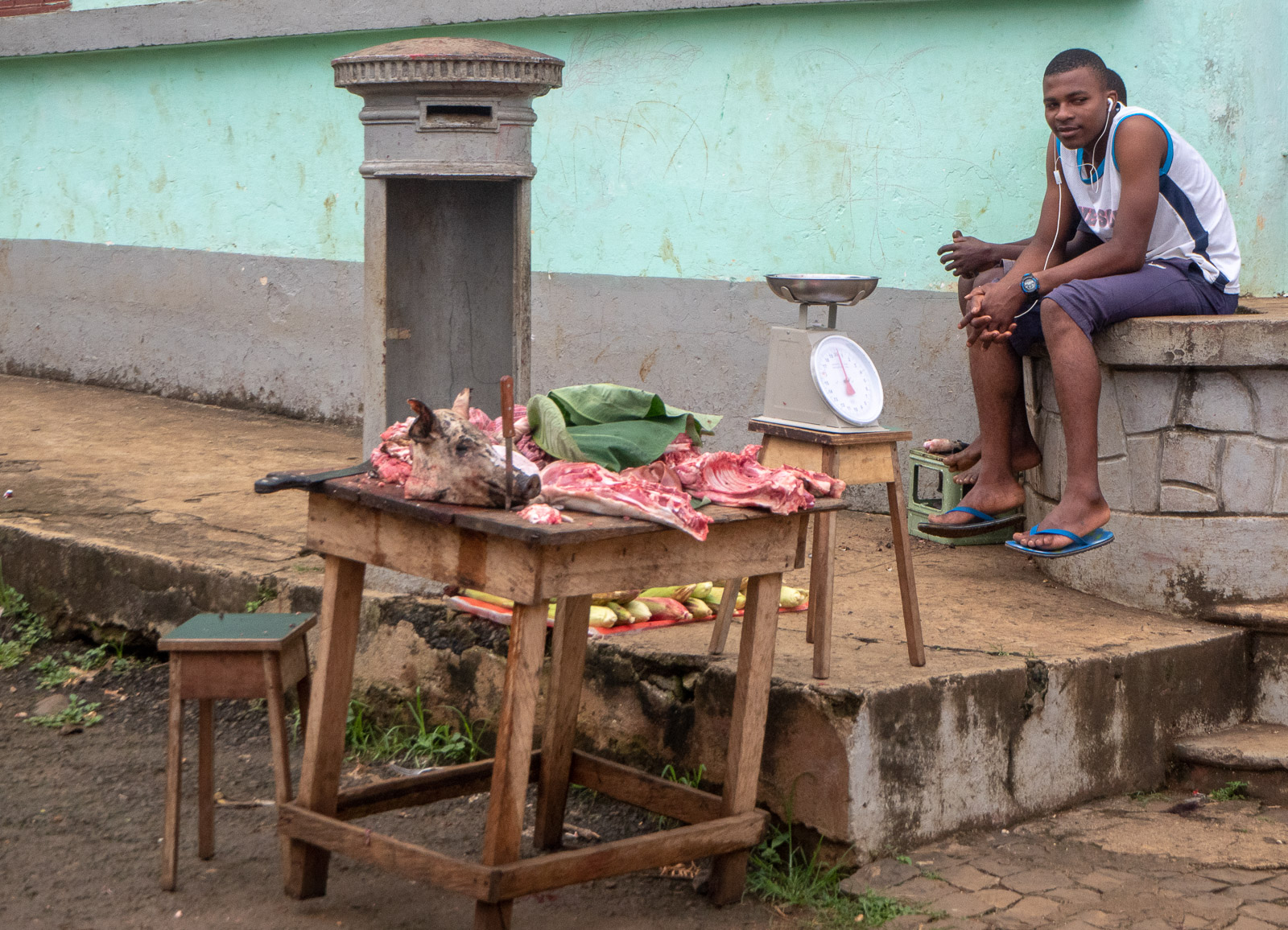 Me, turistit, kiinnitimme Trindadissa ensin huomiota sivukadun nurkan “lihakauppaan”, jossa oli tarjolla porsas pilkottuna useampaan osaan. Myös kaivolla asioivat nuoret äidit selässä mukana kulkevien pienten lasten kanssa oli osa sellaista kuvaa pienestä afrikkalaisesta kylästä, jonka oikeastaan odotimme jo Afrikkaa muutaman viikon kierreltyämme näkevämme.