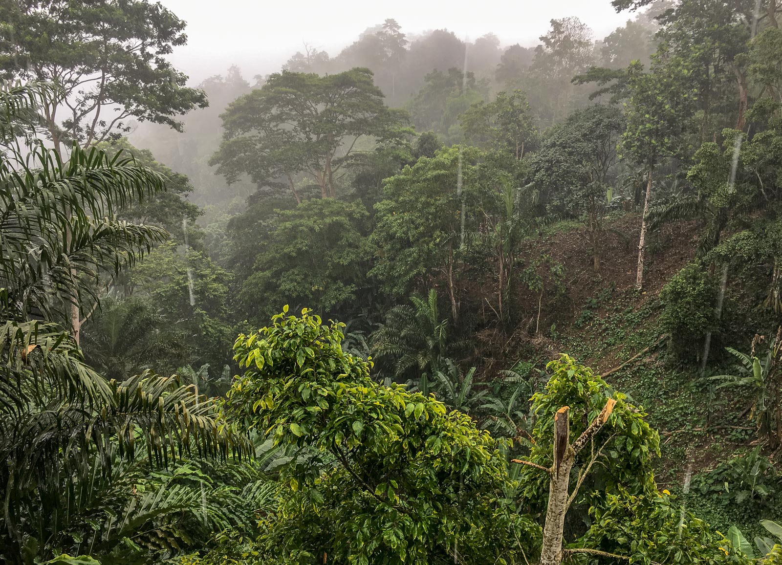 Me arvostimme ihan erityisesti ravintolan sijaintia korkealla pilvisademetsän yllä. Päivämme São Tomélla oli ollut pilvinen, kuten kai monet päivät tällä Atlantin saarella. Ravintolan terassille asettuessamme näimme vielä sademetsääkin, mutta vähitellen pilvi tiivistyi läpinäkymättömäksi ja lopulta alkoi sataa, kaatamalla.