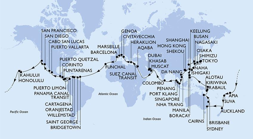 Kiitos Sofia! Maailman kiertäminen laivalla on itse asiassa edullista – tuo koko kierros taitaa maksaa halvimmassa hyttiluokassa jotain vähän yli 10 000 euroa, sisältäen siis myös kaiken ruuan. Yksi tuttavapariskuntamme on tuollaisen matkan tehnyt, tosin ovat välillä jättäytyneet pois laivalta jonkun pätkän, matkailleet välillä itsekseen ja sitten taas palanneet laivaan toisessa satamassa.