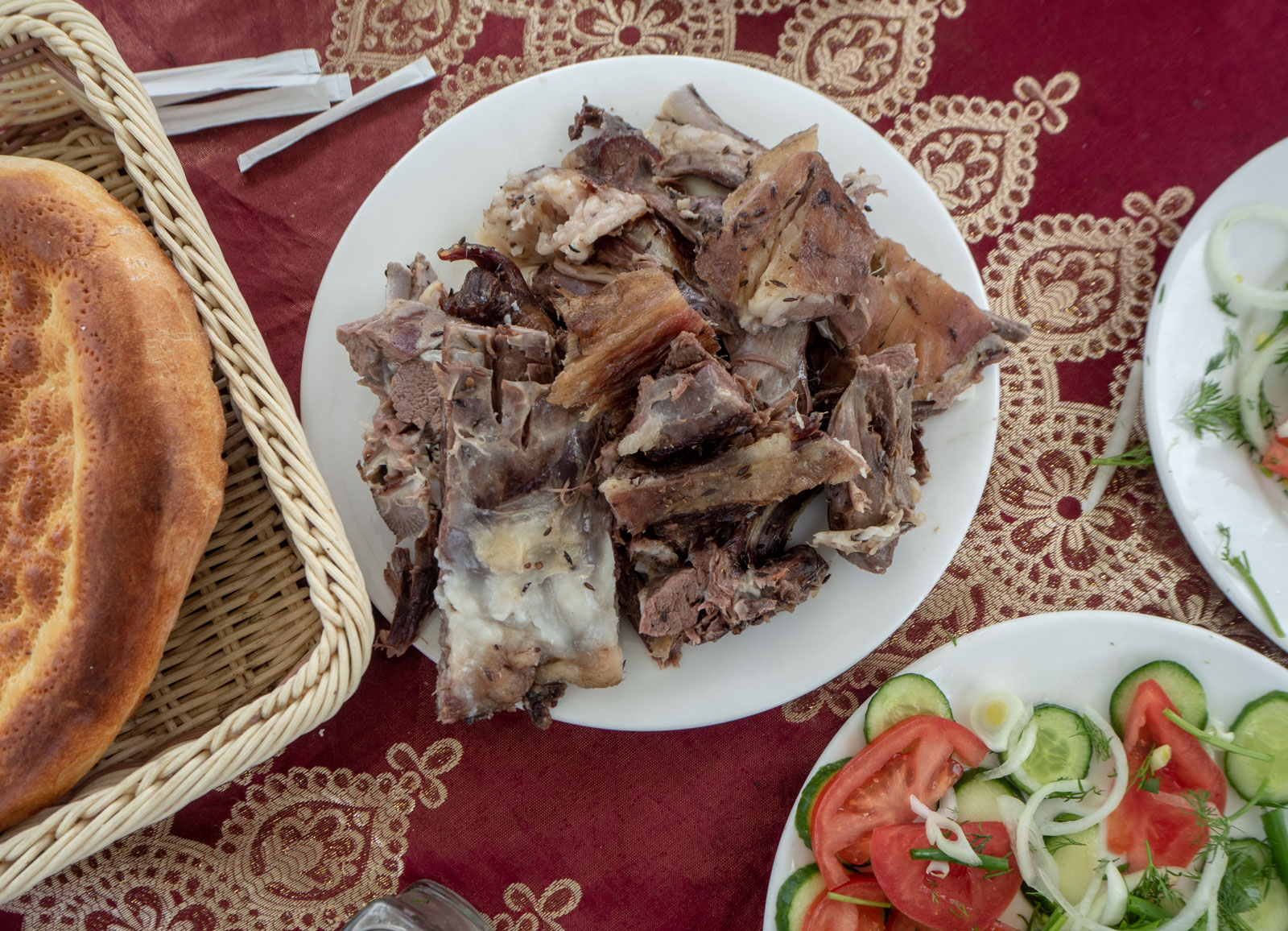 Taukopaikkoja on harvassa, mutta ihmiset niissä sydämellisiä. Nautimme välillä teetä ja keksejä pienessä teltassa ja myöhemmin savulammasta kesäisen huvimajan tyyppisessä loosissa lumen keskellä. Ruokalistalla on vain leipää, salaattia ja savulammasta, joka valmistetaan kokonaisena maakuopassa. Jos lammas ei kelpaa, niin vaihtoehtona on … leipää ja salaattia. Täkäläisissä rekkakuskeissa, joiden suosiossa paikka kuulemma on, ei taida olla vegaaneja.