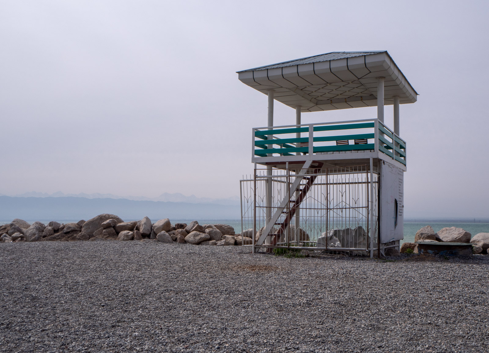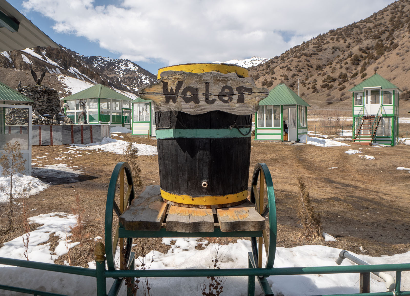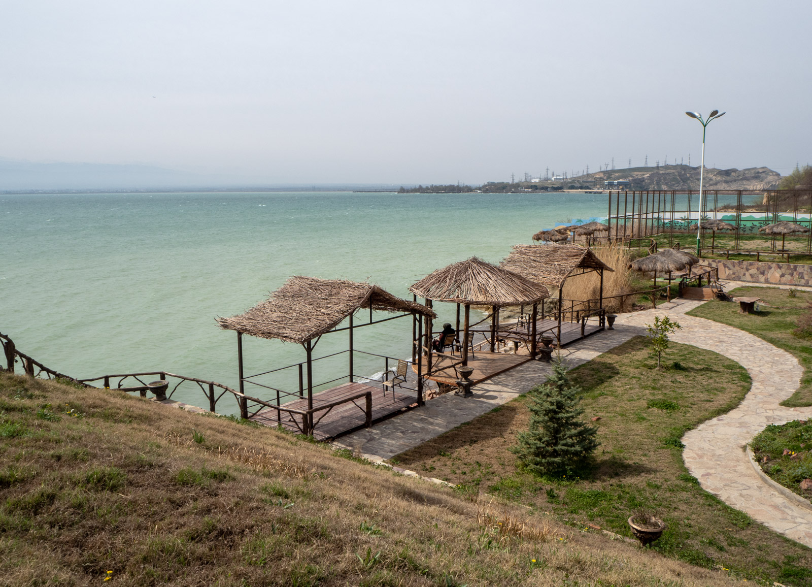 Bahoriston kylpylä sijaitsee Kairakumin tekojärven rannalla. Muuta merta ei Tashkentissa olekaan, mutta tekojärvi on niin suuri, että kyllä se merestä käy, varsinkin tuulisena päivänä. Maaliskuussa kylpylän ranta on vielä autio ja kahvilan pitäjä valmistautumaton 10 hengen vierailuun, mutta kyllä kyllä täälläkin lyhyesti kannatti pysähtyä. Tässä on jotain samaa kuin Jurmalassa.