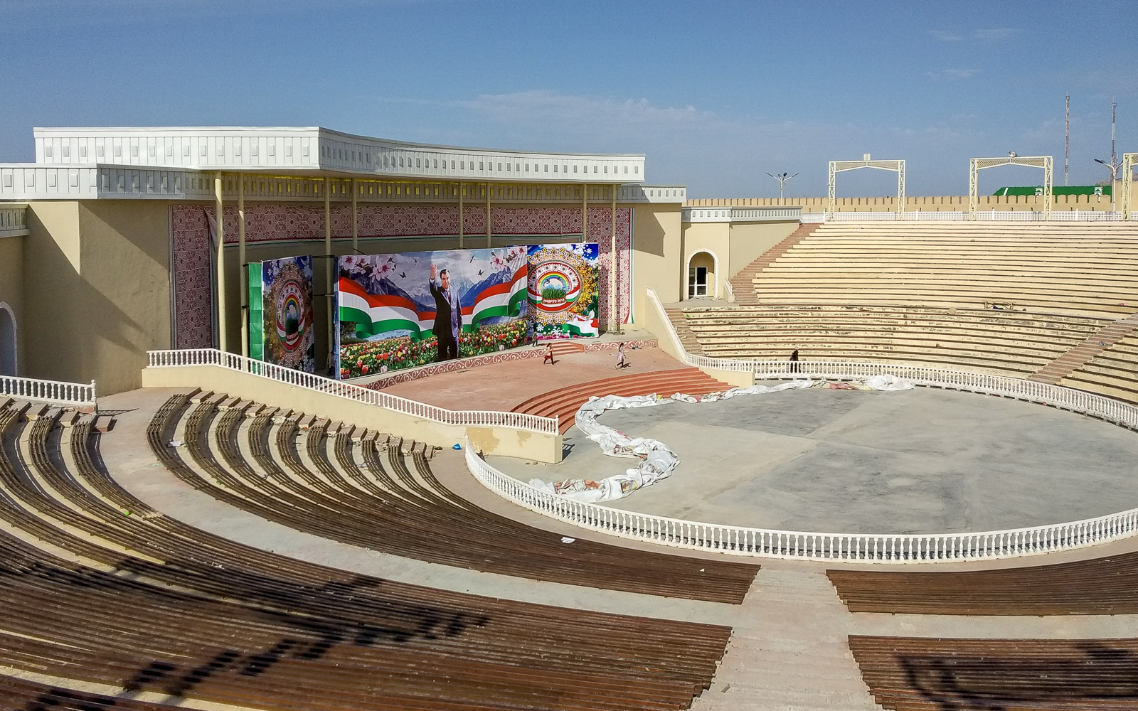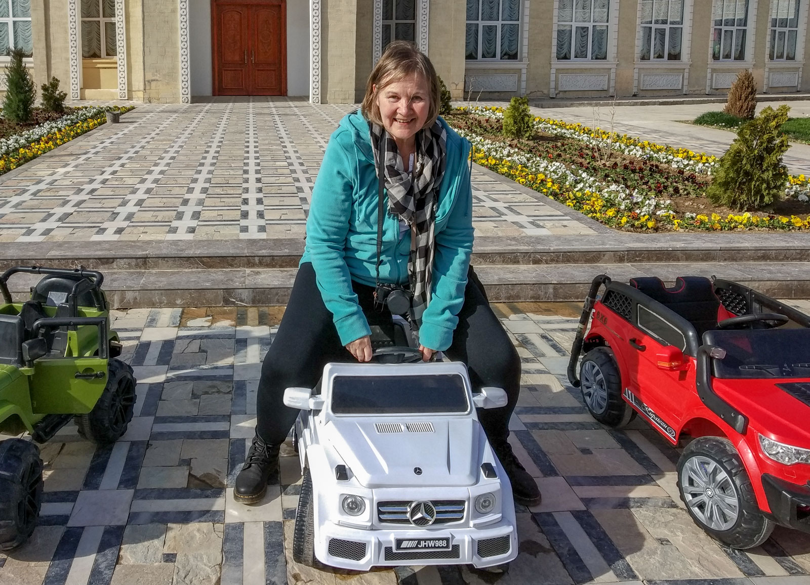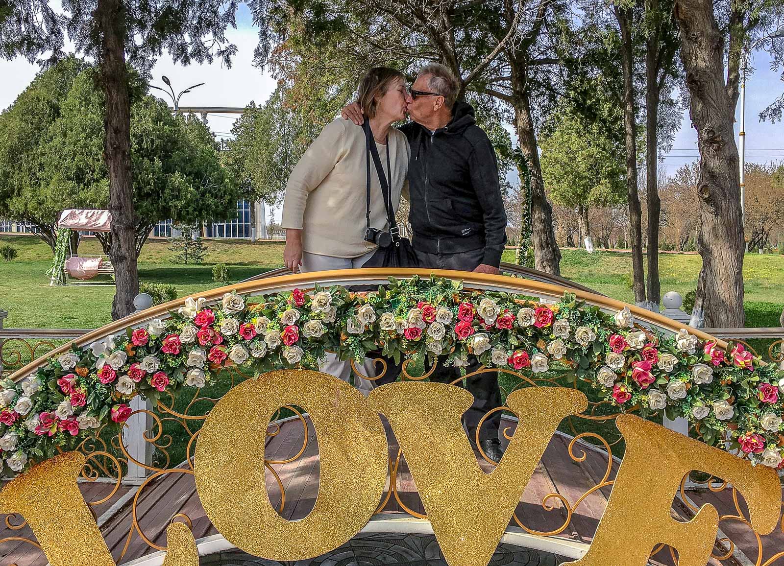 “Pakollisen” kierroksen jälkeen ehdimme vielä kiertelemään Khujandin linnoituksen viereisessä puistossa. Pääsemme, turisteina, pienellä anomisella, puistoon, jota vasta valmistellaan presidentin vierailuun ja köysiradan avaamiseen. Kymmenet puistotyöntekijät istuttavat tänne tuhansia ja taas tuhansia värikkäitä kukkia juhlaa valmistellen. Matkamuistomyymälätkin ovat auki, vaikka puisto ei varsinaisesti olekaan – mutta olimme jo jääkaappimagneettimme Tadzikistanista ostaneet eivätkä puutarhatontutkaan houkutelleet!