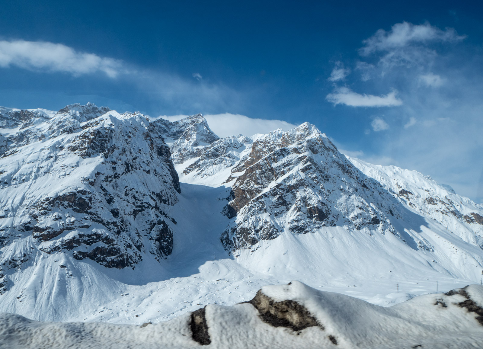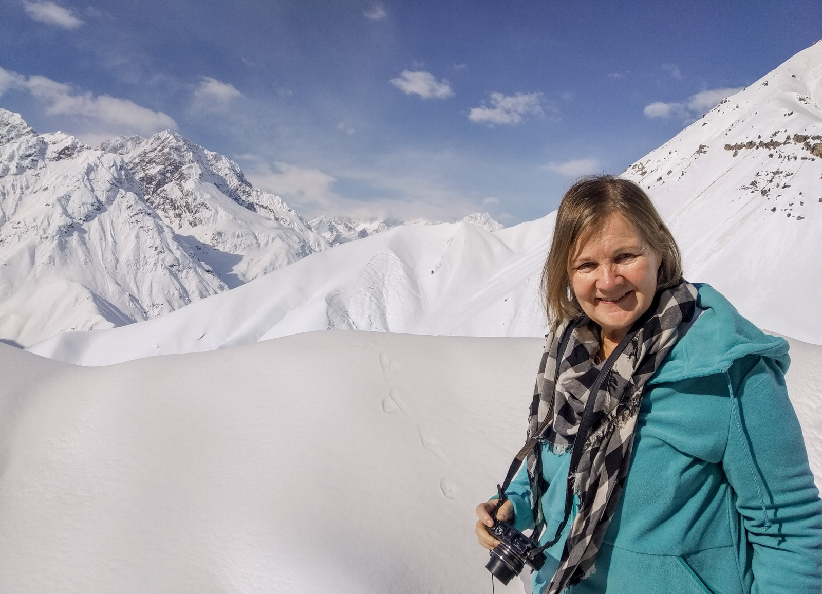 Tämäkin reitti oli maaliskuun lopulla ihan riittävän talvinen. Pian Dushanbesta lähdettyämme vuoret kohosivat ympärillämme valkoisina pienen bussimme kiivetessä aina vaan korkeammalle ja pysähtyessämme muutamaan kertaan venyttelemään jalkojamme ja ottamaan kuvia muutenkin kuin bussin ikkunasta saimme kahlata tien varressa lumessa nilkkojamme myöten. Mutta näkymät olivat huikeita! Korkeimmillaan tämäkin reitti käy lähes 3 000 metrissä.