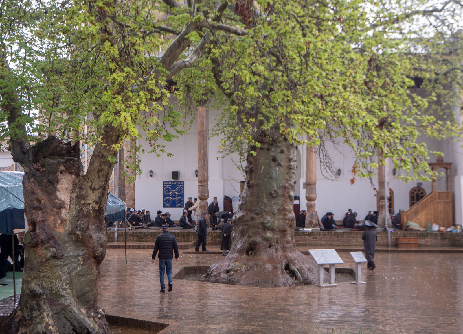Muistomerkkejä mielenkiintoisempaa täällä oli kuitenkin, perjantaina, muslimien pyhäpäivänä, seurata miesten saapumista jumalanpalvelukseen. Sateisella säällä moskeijan pihalle oli pystytetty telttoja, joihin levitettiin “joogamattoja” lattiaksi. Naisia ei näkynyt, he kuulemma rukoilevat kotona.