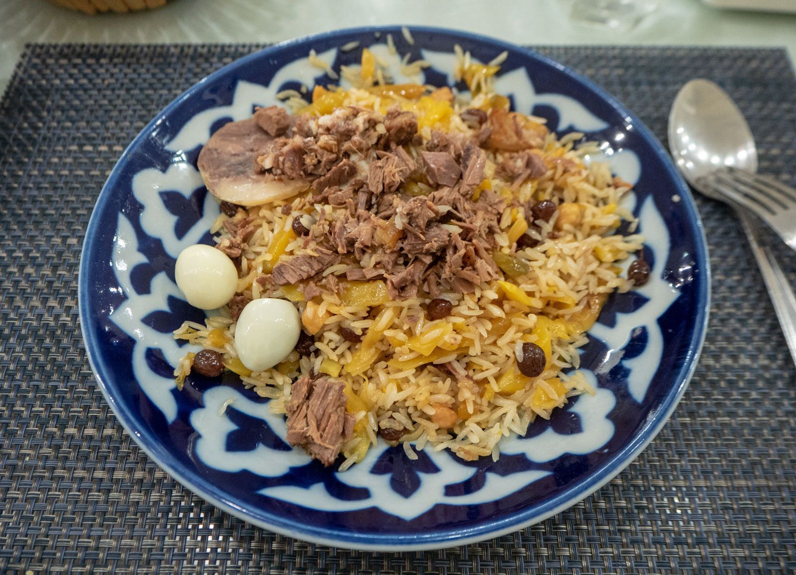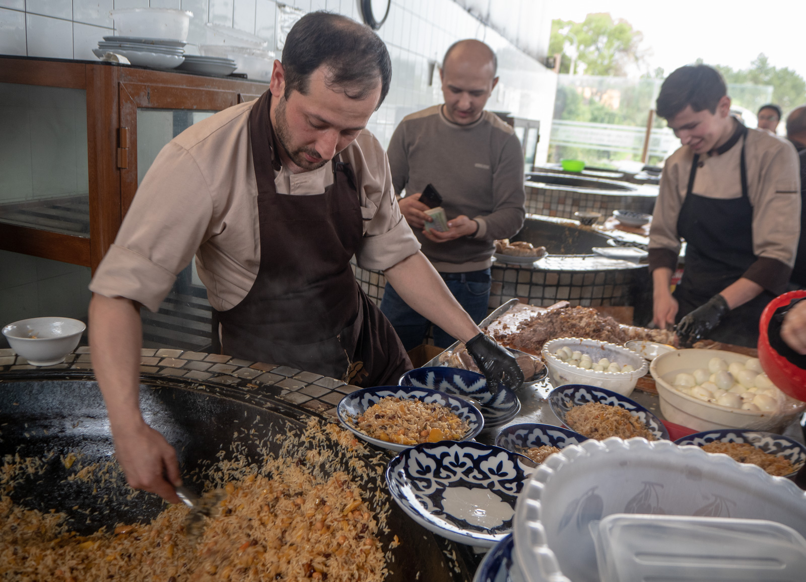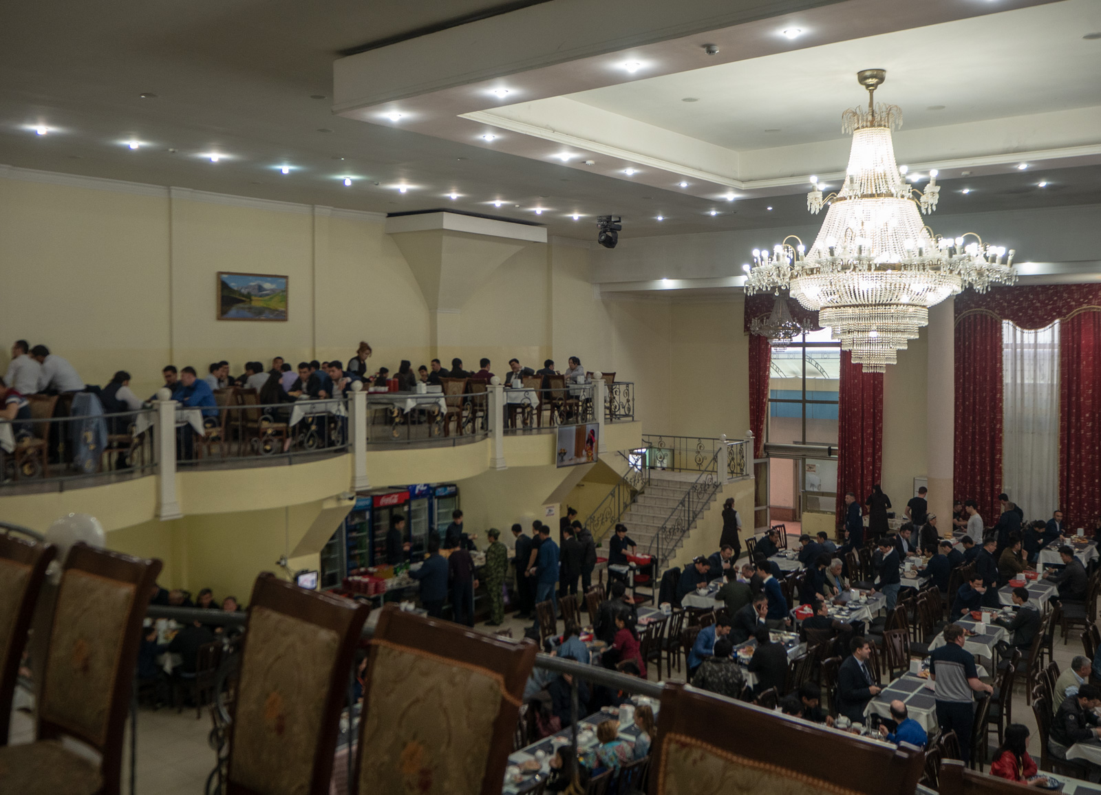 Hotellin ravintolaa emme testanneet, sillä aloitimme Uzbekistanin vierailumme syömällä pilahvia, kuten jo Khujandin yhteydessä vihjailin. Pilahviravintola oli todellinen kansan ravintola, johon mahtui kahteen kerrokseen ruokailemaan kerralla satoja ihmisiä, jotka kaikki söivät siis samaa ruokaa, pilahvia. Ruokaa myytiin myös reippaaseen tahtiin ravintolan alakerran Take away -tiskiltä mukaan otettavaksi niille, jotka eivät ehtineet tai mahtuneet sisälle ravintolaan. Kivan paikallinen kokemus Tashkentin tv-tornin juurella!