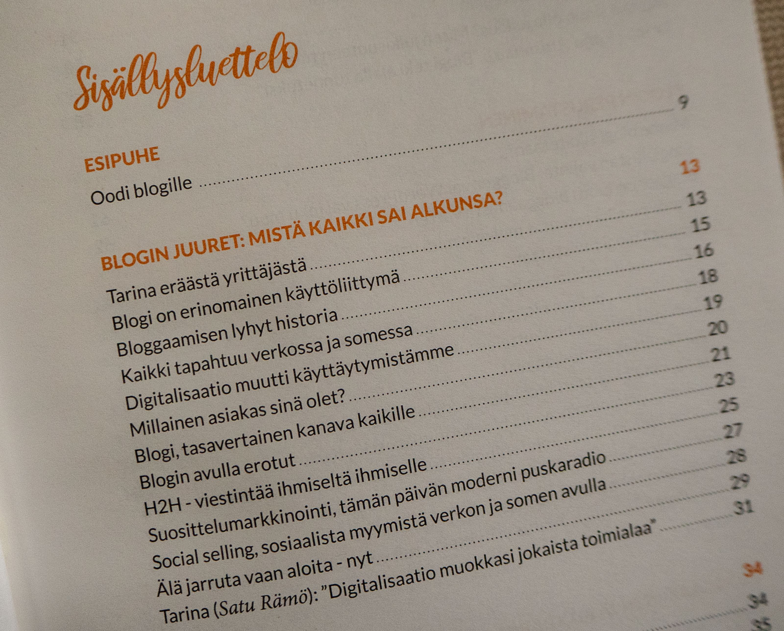 Kyllä, sitä kansikuvaa klikkaamalla aukesi lopulta näkymä, josta löytyvän nuolen takaa kolme kertaa painamalla löytyi kirjan sisällysluettelo. Toivottavasti aloittelevat bloggaajat myös löytävät sen nyt – Menestystä kirjallesi :)