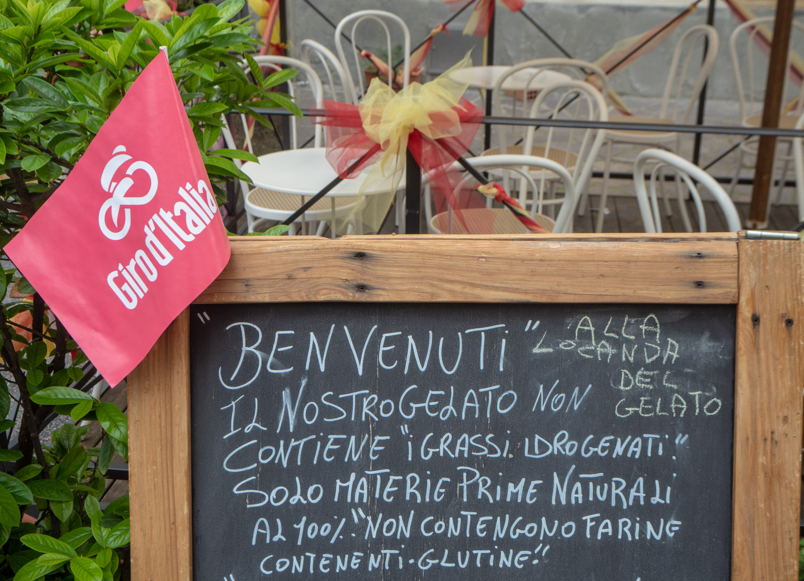 Meitä Vincin kaupungin nykyaika veti puoleensa: kaupunki oli parhaillaan koristautumassa pinkkiin nauhoin, ruusukkein ja istutuksin kohta sinne saapuvan Giro d’Italian takia. Kahvilat, ravintolat ja myymälät valmistautuivat suureen tapahtumaan. Yksi kahvilayrittäjistä tarjosi meille keksejä – ihan kuin olisi harjoitellut tarjoilua kaupungin kohta täyttävälle vierasjoukolle. Ja tarttuipa meille mukaankin yhdestä kukkapenkistä Giro d’Italia -viirikin …