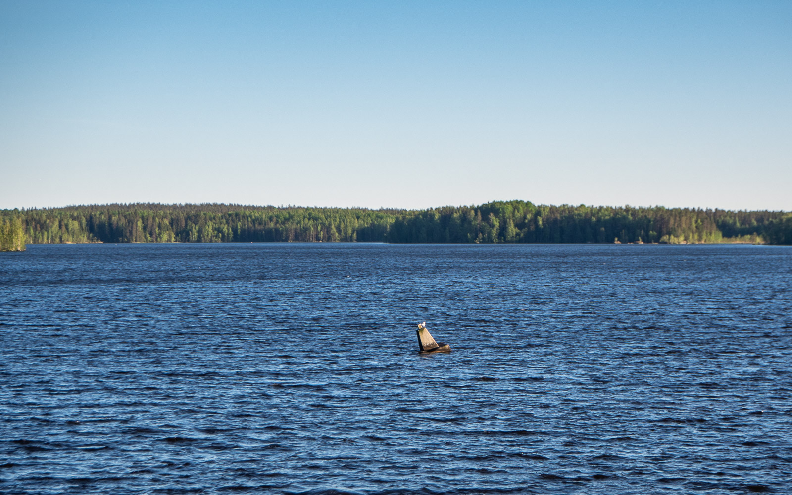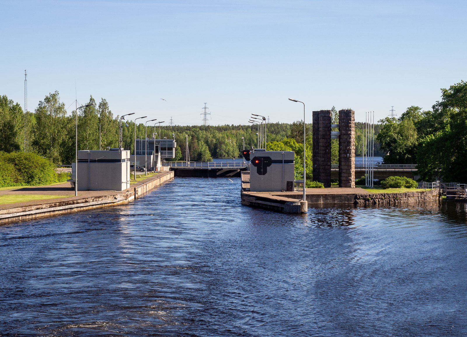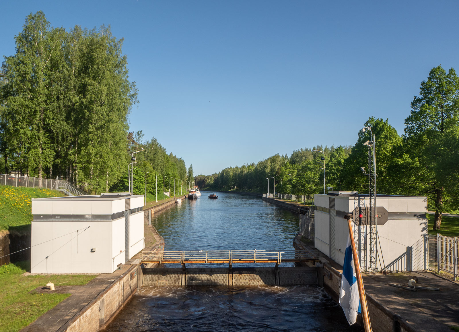 Ensimmäinen sulku. Useimmat matkustajat viihtyvät M/S Carelian yläkannelle aamun hienoisesta viileydestä huolimatta. Mekin. Vaikka olemmekin katselleet rannalta Panaman kanavaa ja menneet purjeveneellä Mälaren-järvelle, mutta silti, Mälkiä oli aamun ensimmäinen sulku Saimaan kanavalla. Laiva ajaa sulkuun, sulkuportti laskeutuu ja vedenpinta lähtee laskemaan. Painumme syvälle sulkuun. Lopulta olemme riittävän alhaalla ja sulkuportit aukeavat ja jatkamme matkaa.